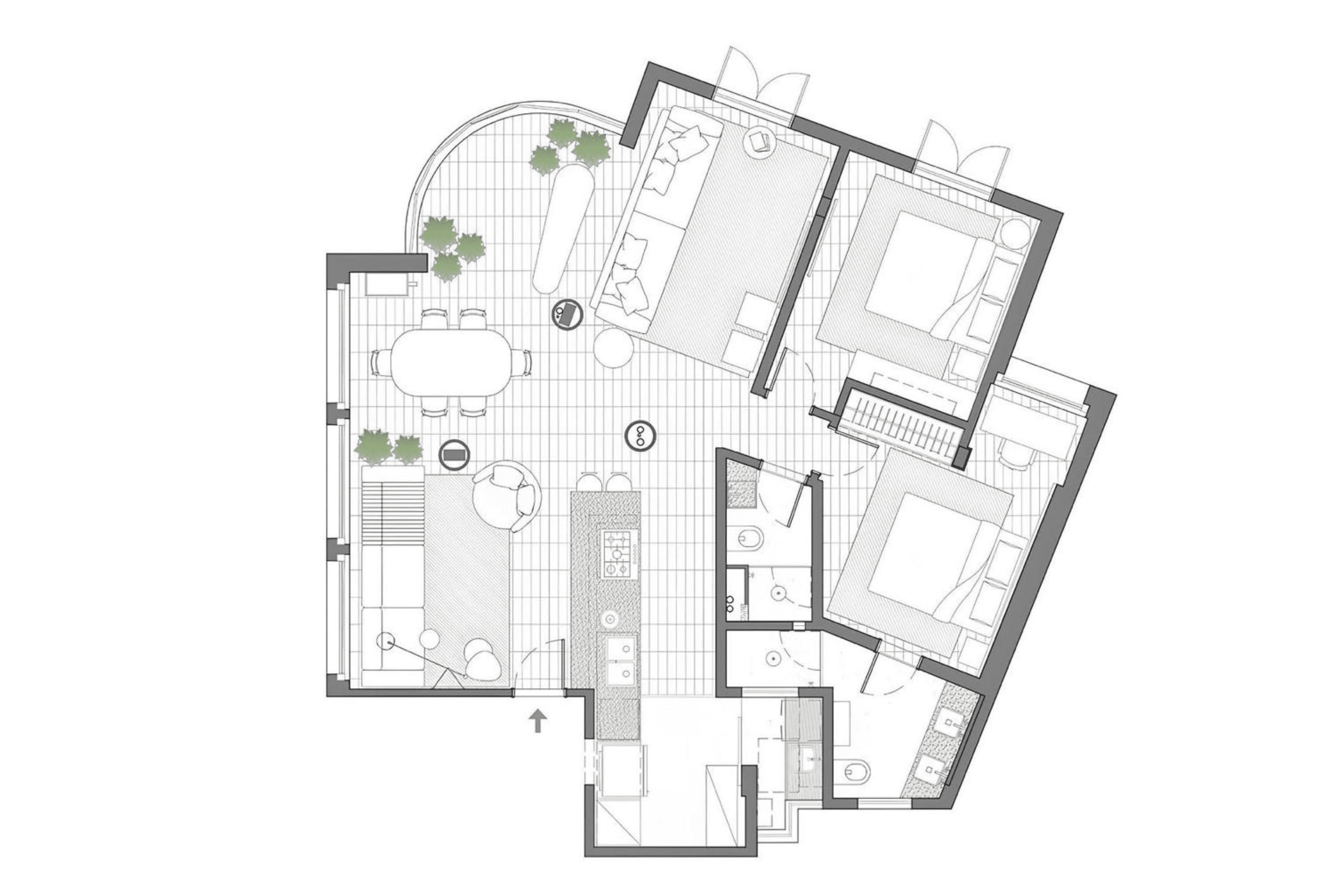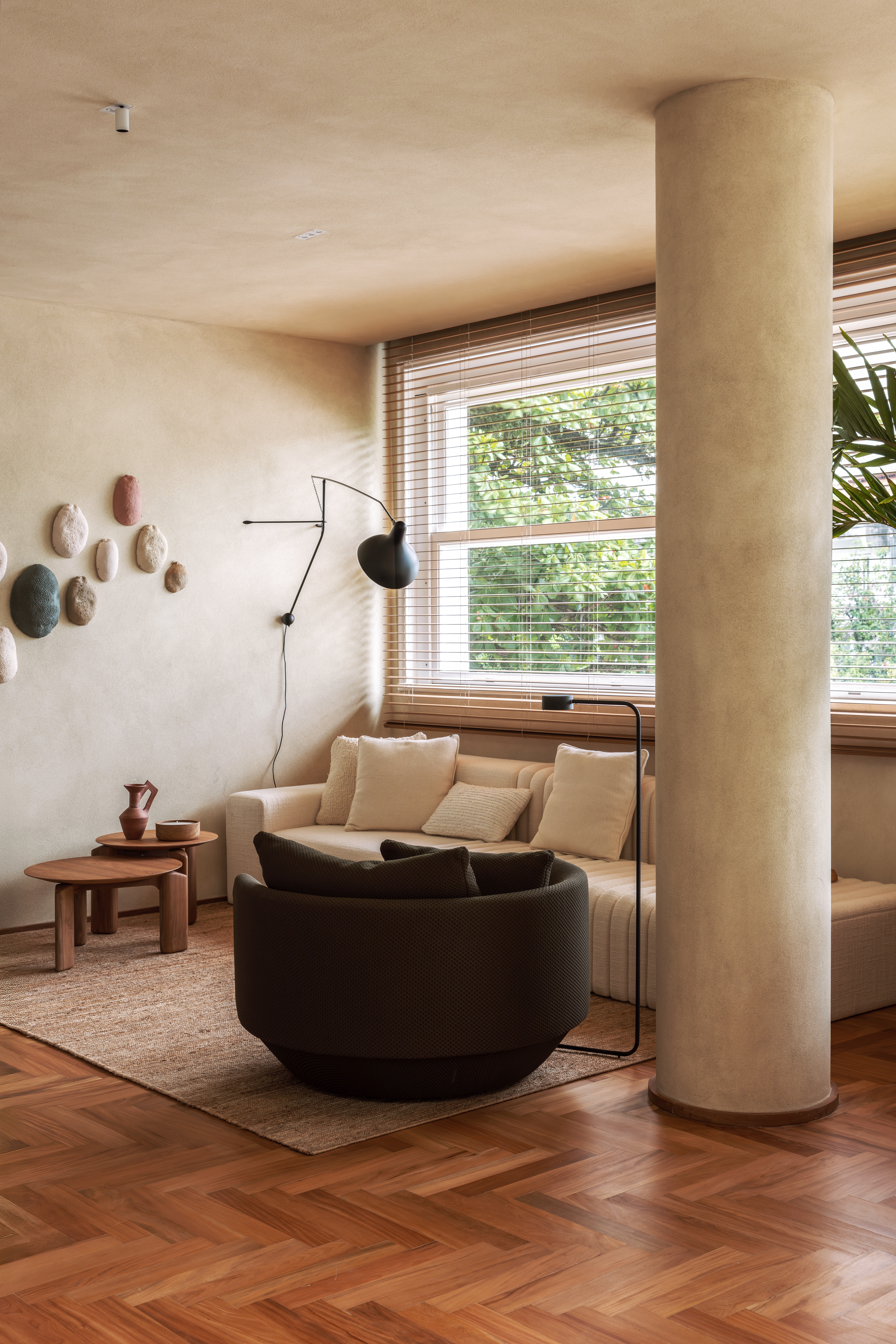 During the renovation, structural columns and plumbing stacks with different diameters were revealed in the social area. To visually organize these elements and integrate them into the architecture, we created cylindrical plaster columns that provide a refined finish and bring unity to the composition.