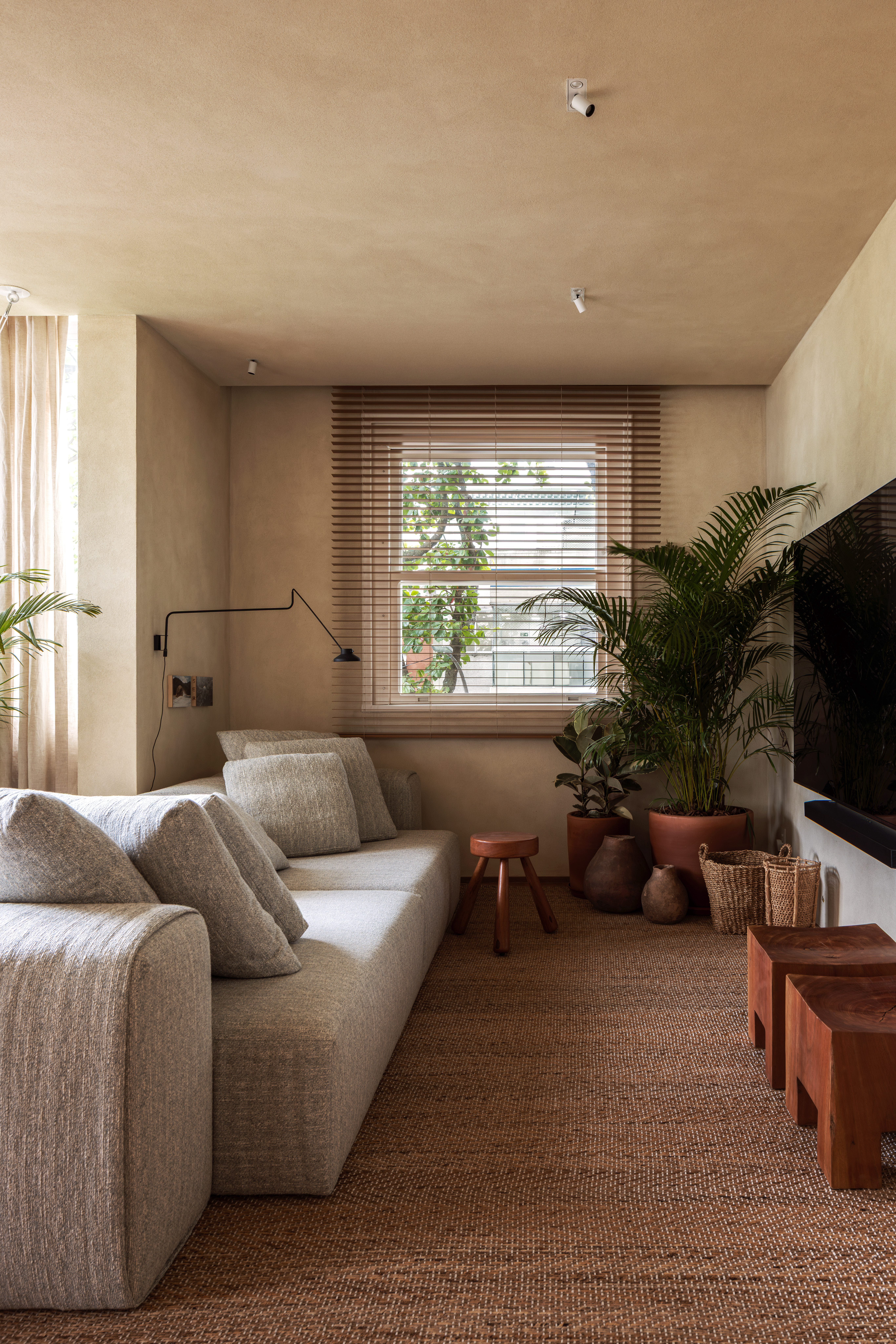The home theater serves as the couple’s relaxation area. The comfortable sofa by Carbono was chosen as the perfect spot to unwind at the end of the day. The composition becomes even cozier with the soft light cast by the wall sconce and the greenery carefully selected by the residents. The space is visually defined by a banana fiber rug from Cia das Fibras.