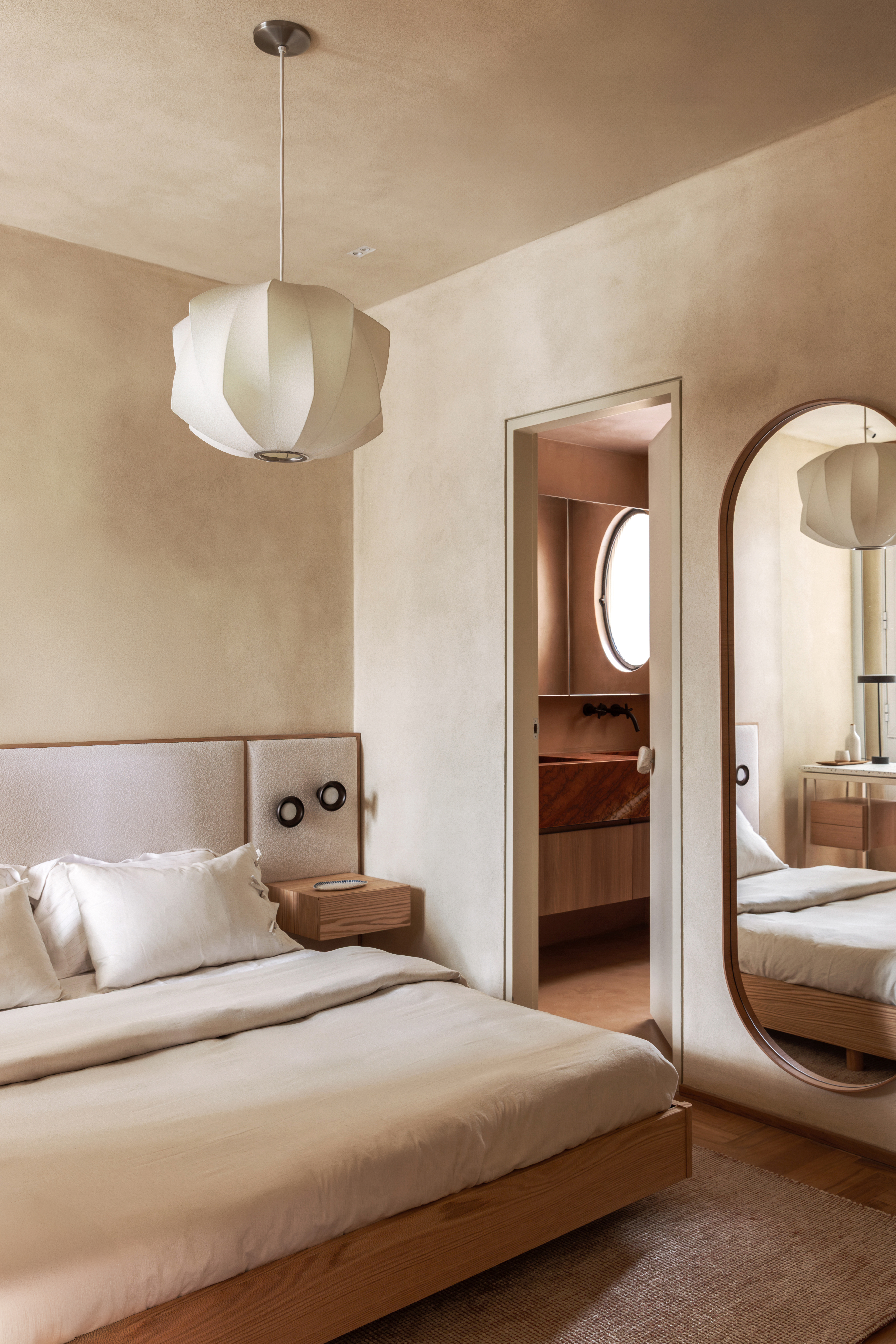 The palette is reinforced in the joinery, all crafted by Madeirol. The combination of light wood, natural materials, and clean lines brings the project closer to a Scandinavian aesthetic, while elements such as low beds, globe-shaped light fixtures, and an emphasis on essentials evoke references from Eastern design. The result is a hybrid atmosphere that blends the restraint of the Japandi style with the tropical lightness of Rio de Janeiro.