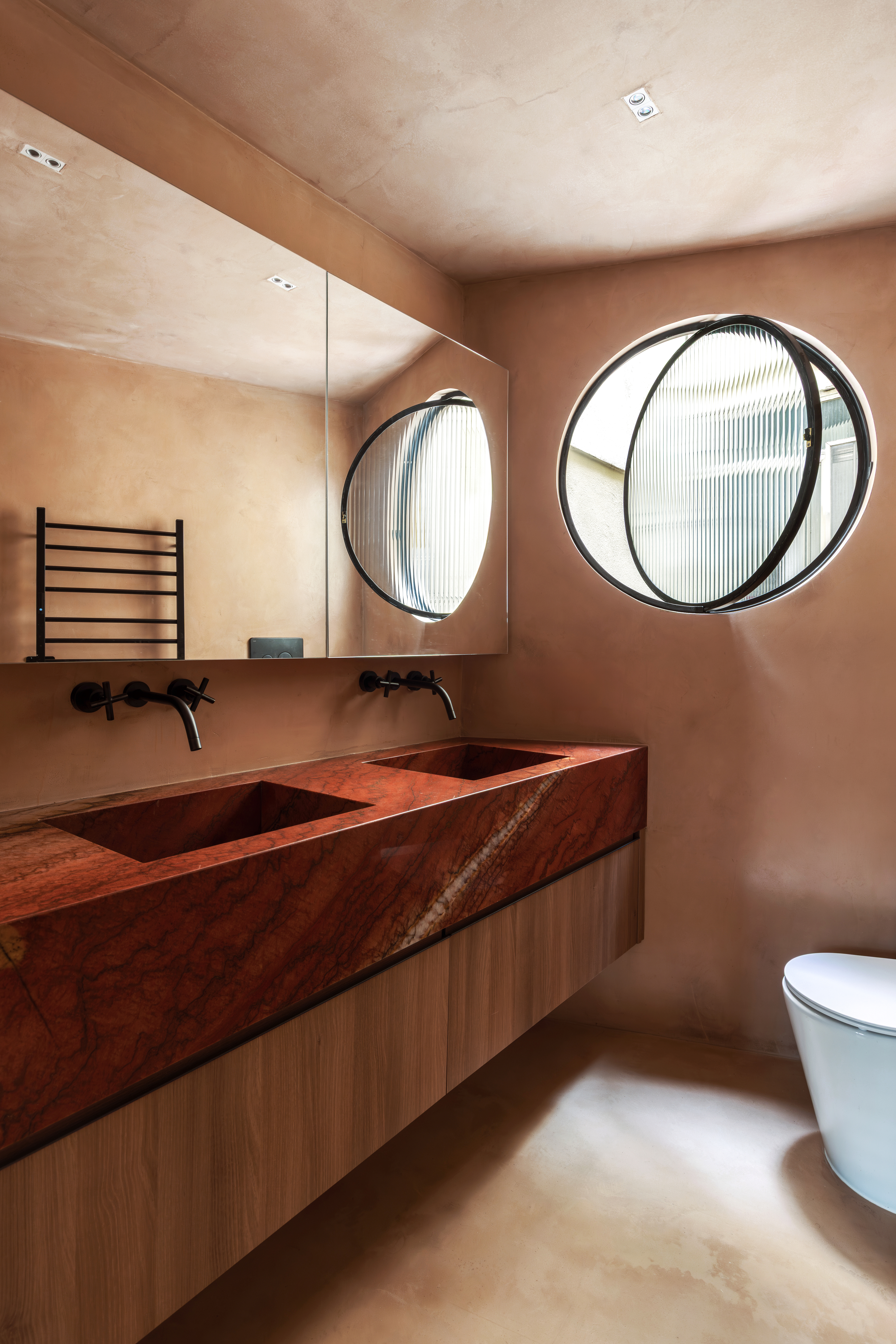 All masonry surfaces received the same natural pigment texture in an earthy tone, creating a continuous and sensory atmosphere. The reference for this choice comes from the landscape of Rio de Janeiro, evoking colors that recall beach sand, the bluish-green tones of the sea, and the deep hues of tropical vegetation.