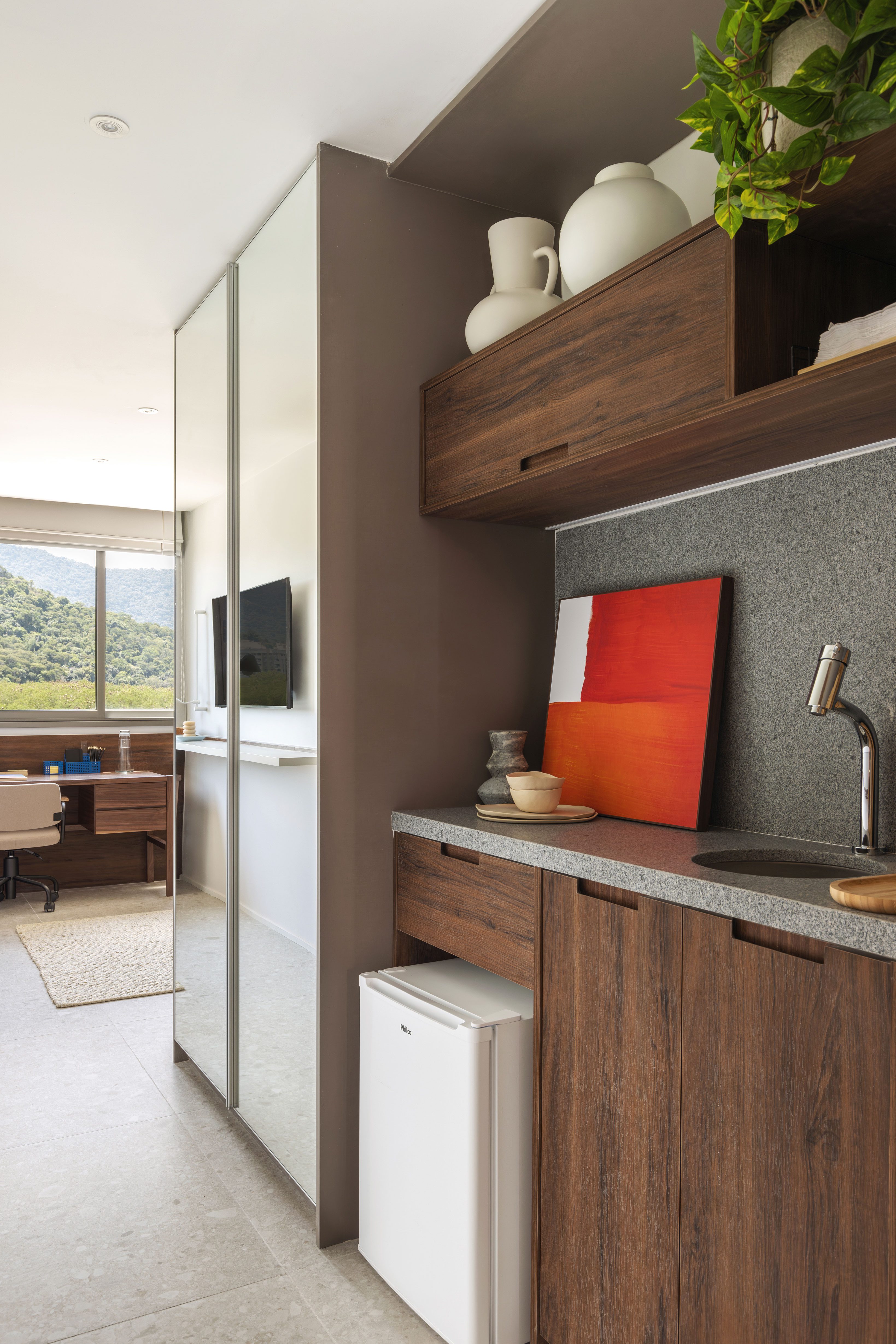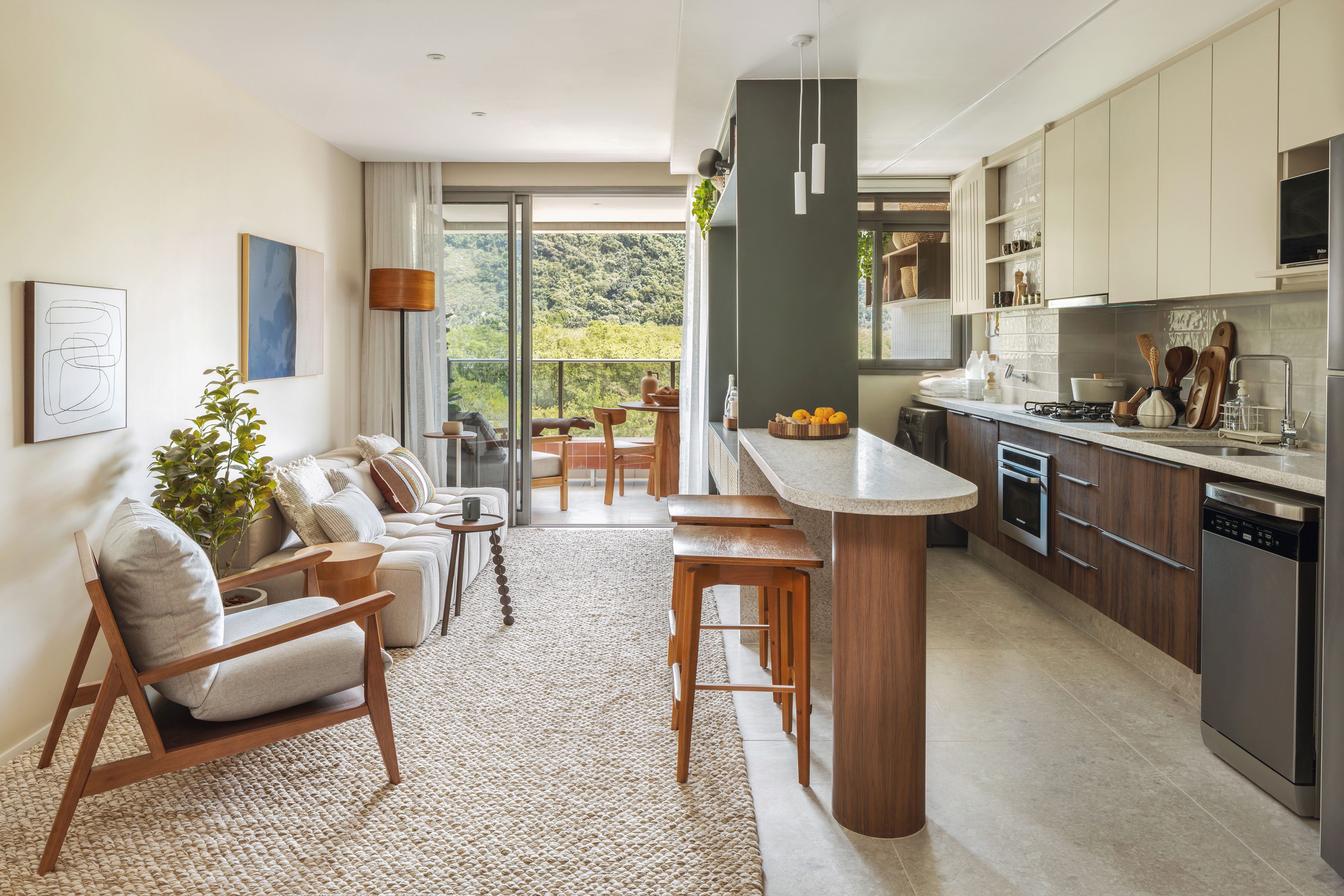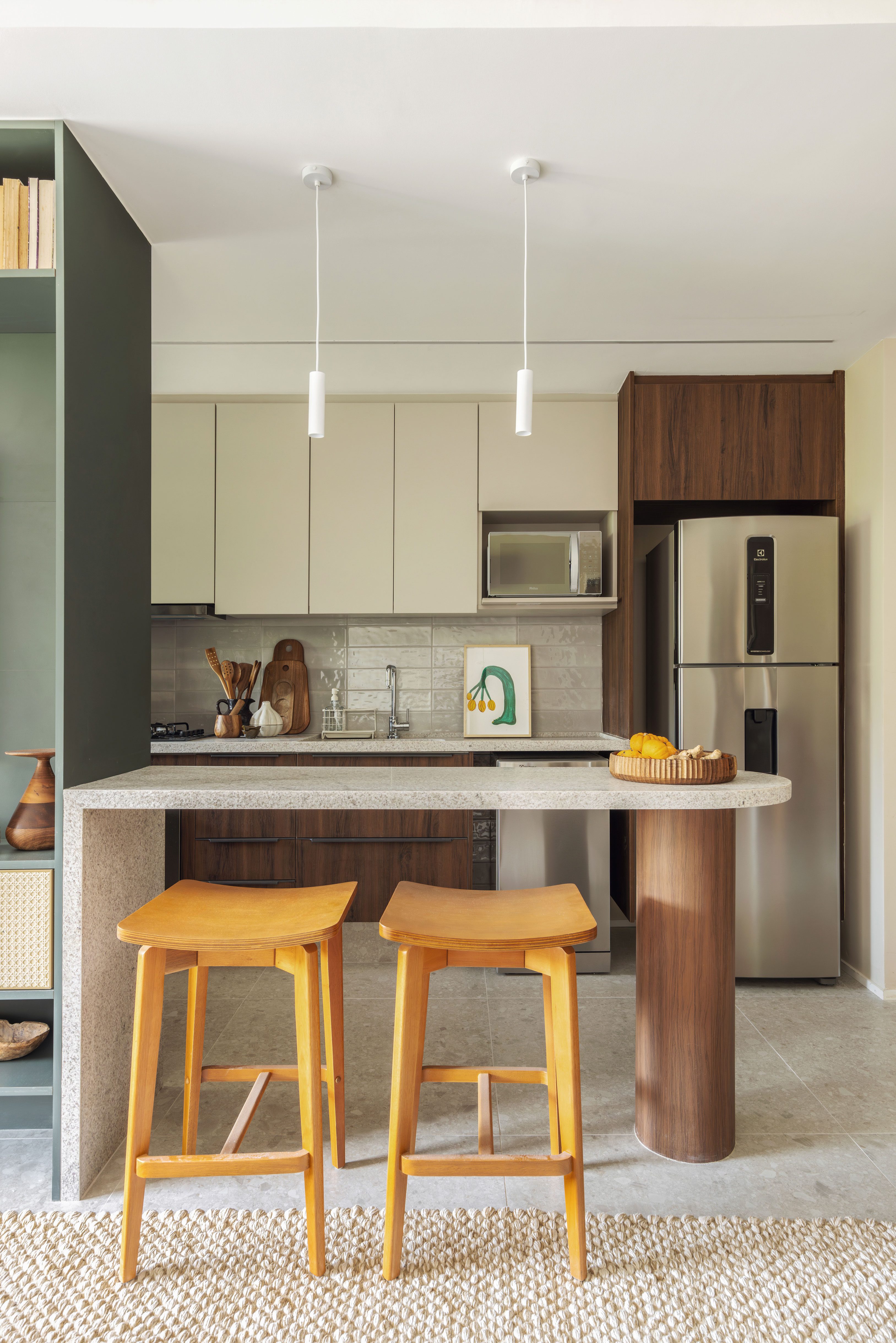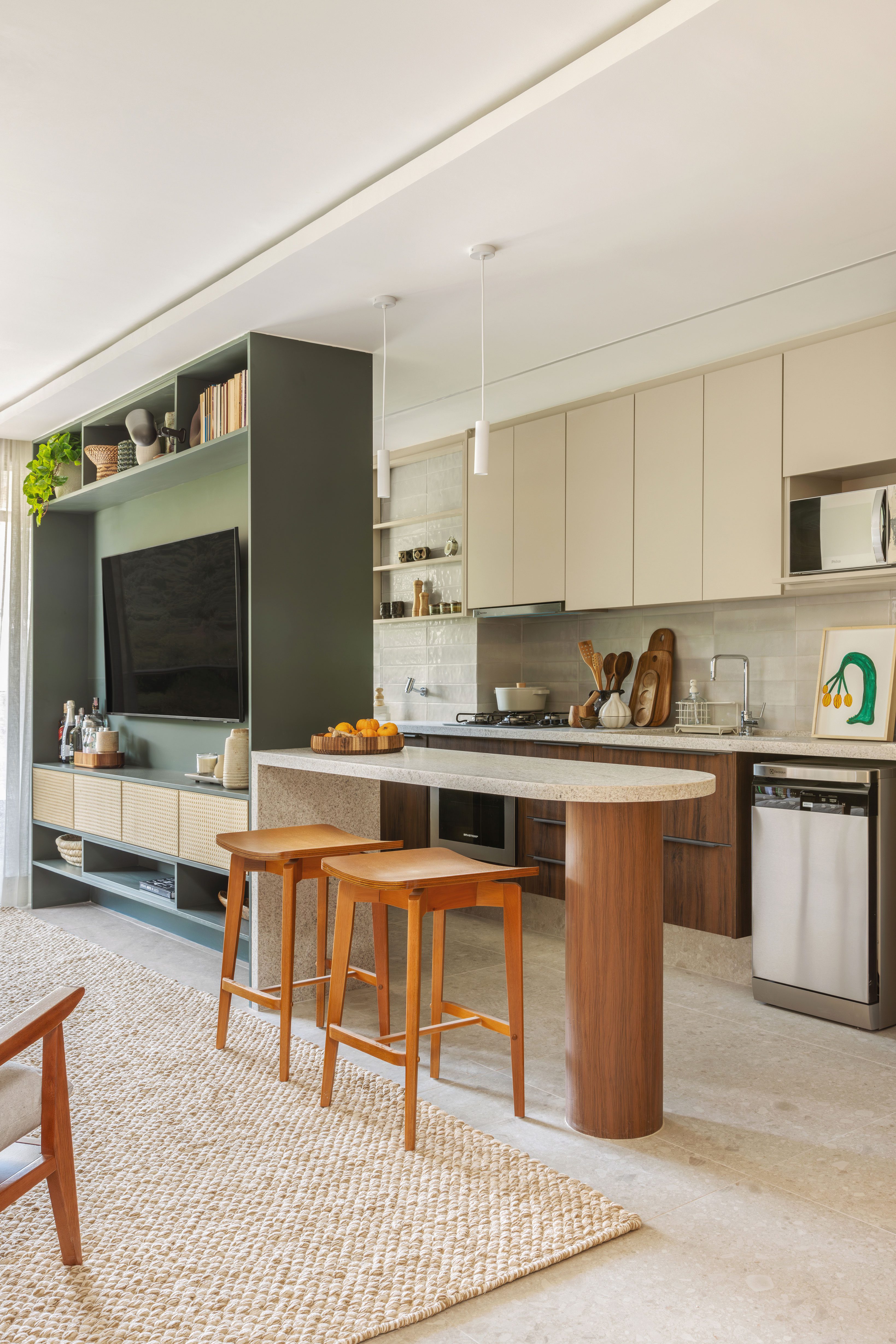 The kitchen, visible as soon as you enter, is compact and integrated with the laundry area. It was designed to offer practicality and functionality. Equipped with a refrigerator, dishwasher, cooktop, microwave, and a washer-dryer combo, it efficiently meets all everyday needs. To give the space a more contemporary feel, we opted for a mix of cabinetry, combining a darker wood tone with a beige hue similar to Coral Paints’ “Bege Amuleto,” which was also applied to the living room wall.