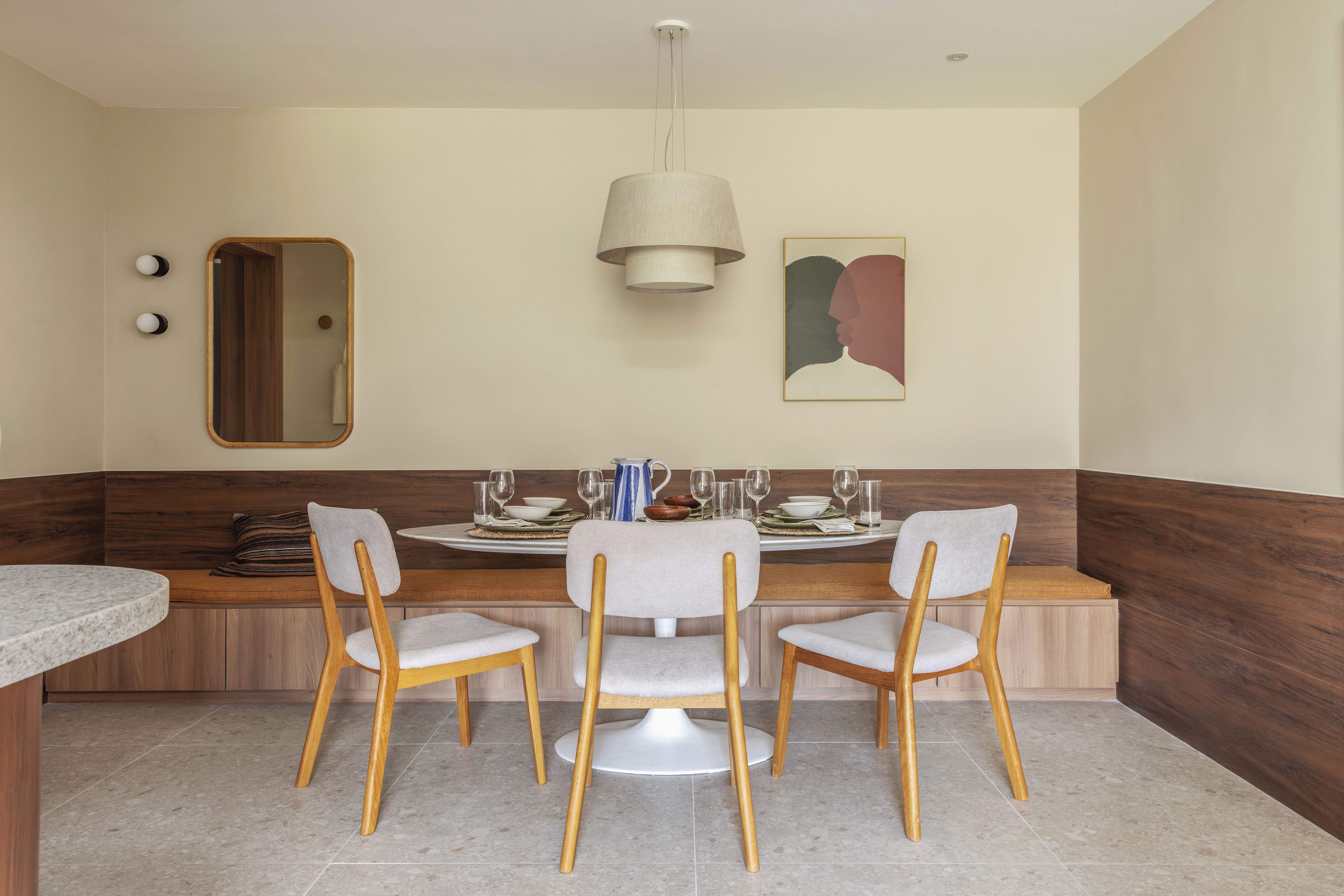 For the dining room, we designed a bench that runs along the entire wall, providing extra seating and incorporating a drawer unit for storage. To highlight the textural richness of the space and enhance the apartment’s sensory experience, we chose warm tones for this area. The Duo Cone Round pendant in fabric, model 5146 by TomLuz, was selected as a key element to deepen the welcoming atmosphere.