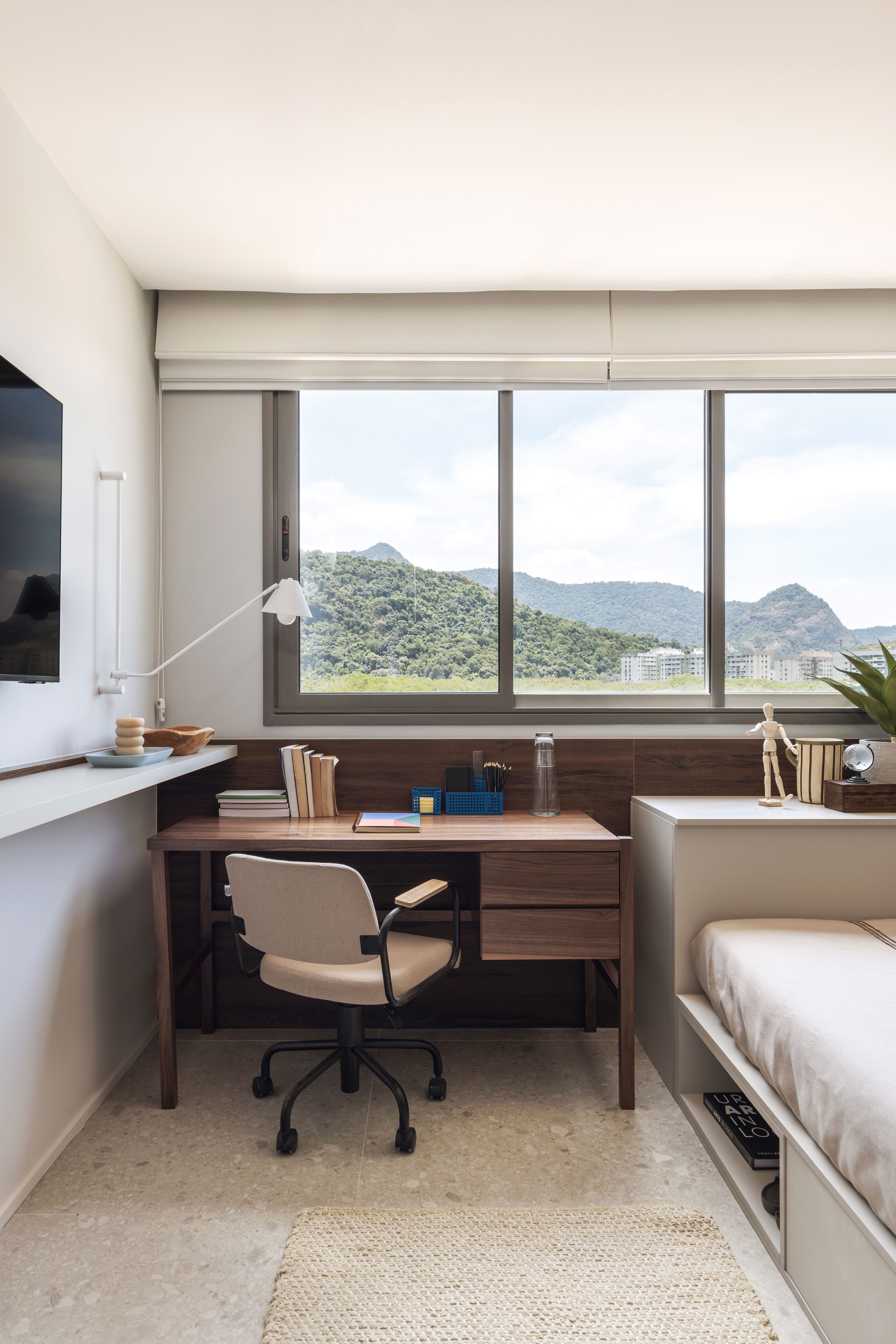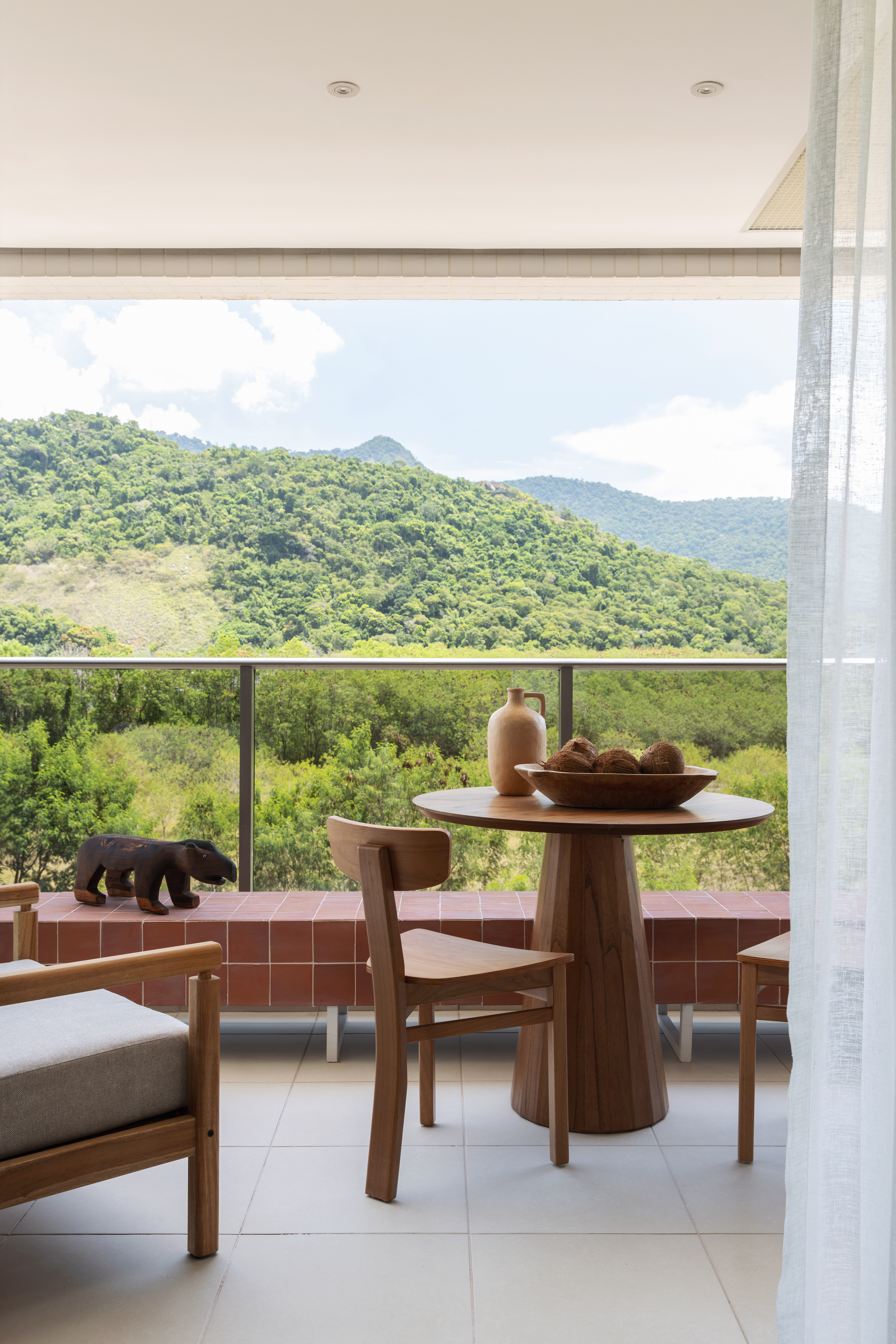 The living room, integrated with the balcony, offers a natural invitation to contemplate the stunning landscape of the Carioca mountains. The interior design prioritized functionality and comfort, with strategically placed furniture that preserves the view, creating an ideal space for relaxation and connection with the outdoors.