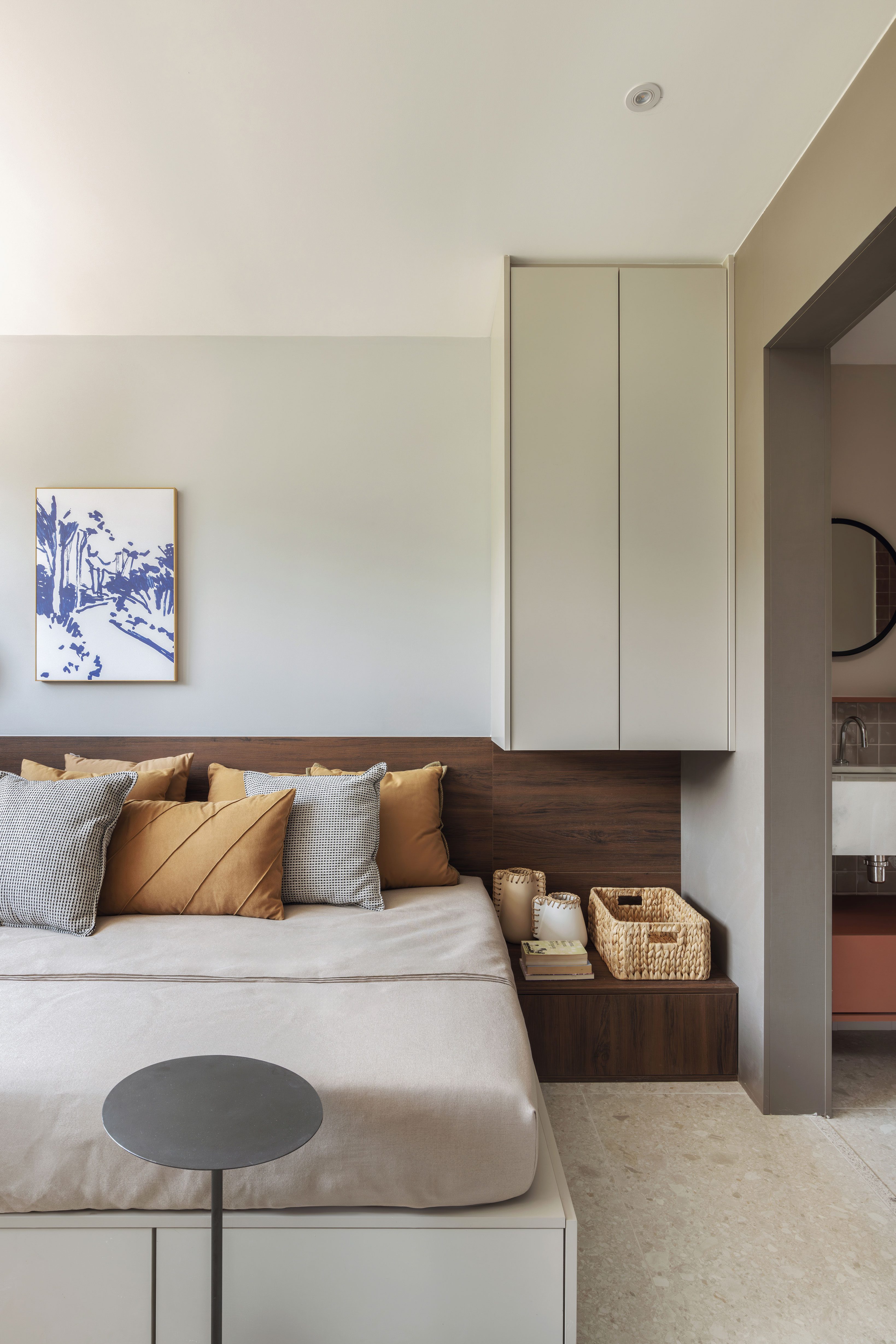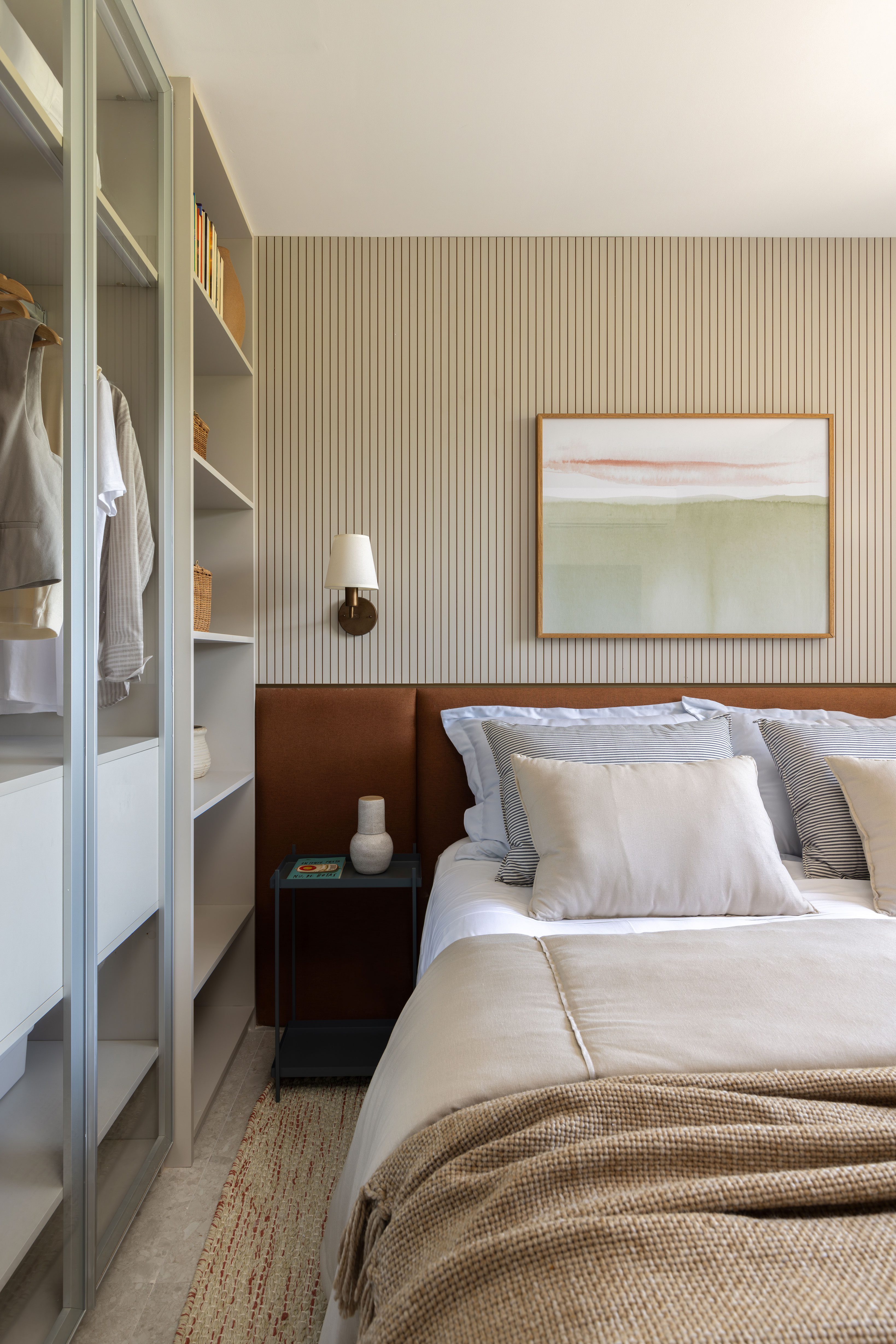 The master bedroom follows a comfortable and sophisticated approach, prioritizing materials that evoke a sense of coziness. The standout feature is the custom-designed glass wardrobe, which allows natural light to filter through, enhancing the sense of space and flow. Behind the bed, a grooved slatted panel creates a visual connection between the terracotta-toned headboard and the light woodwork of the open wardrobe, reinforcing the room’s airy and spacious feel. The composition is balanced by the Greeny Field Landscape artwork from Urban Arts, which adds a touch of serenity to the space.