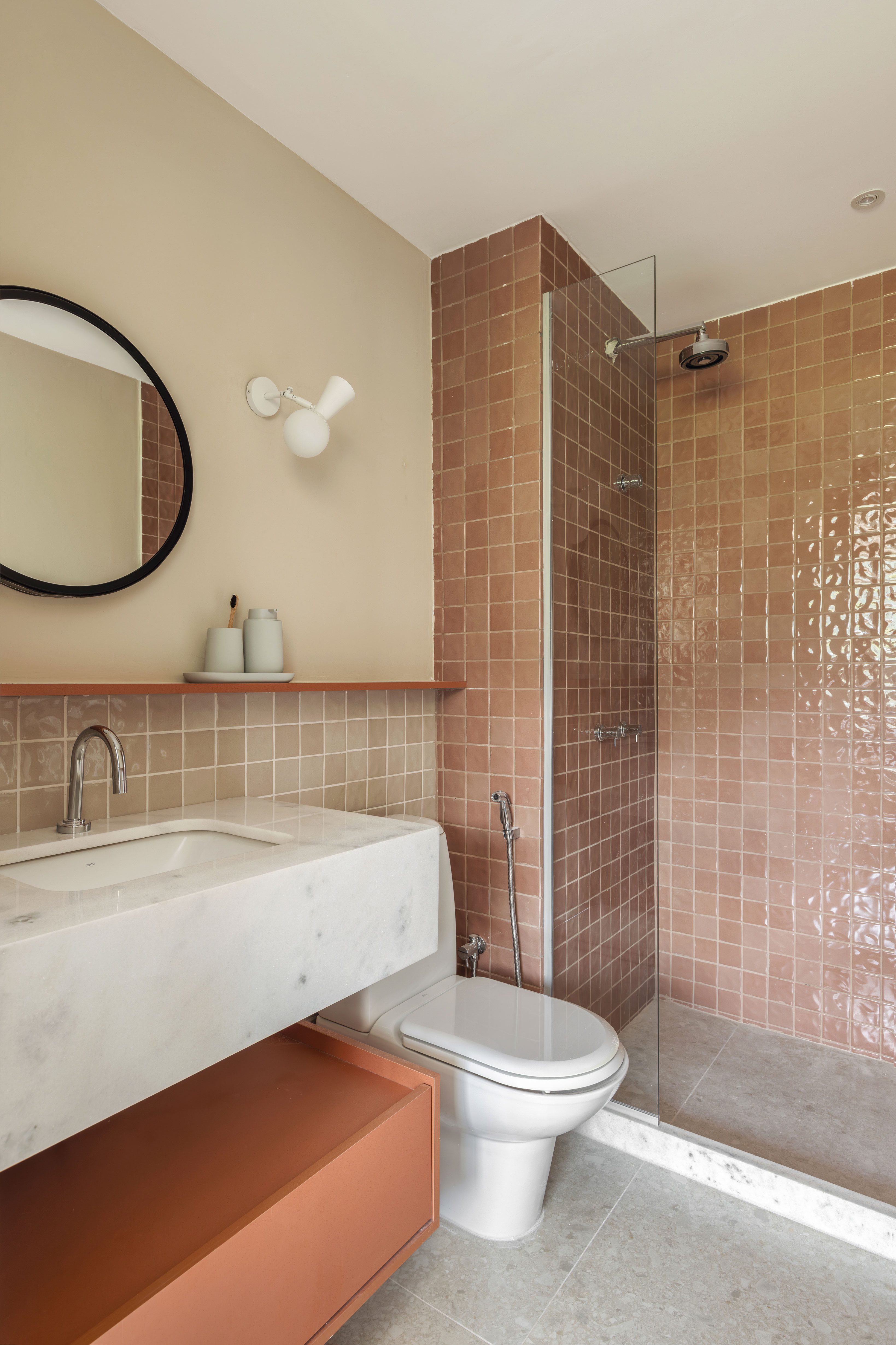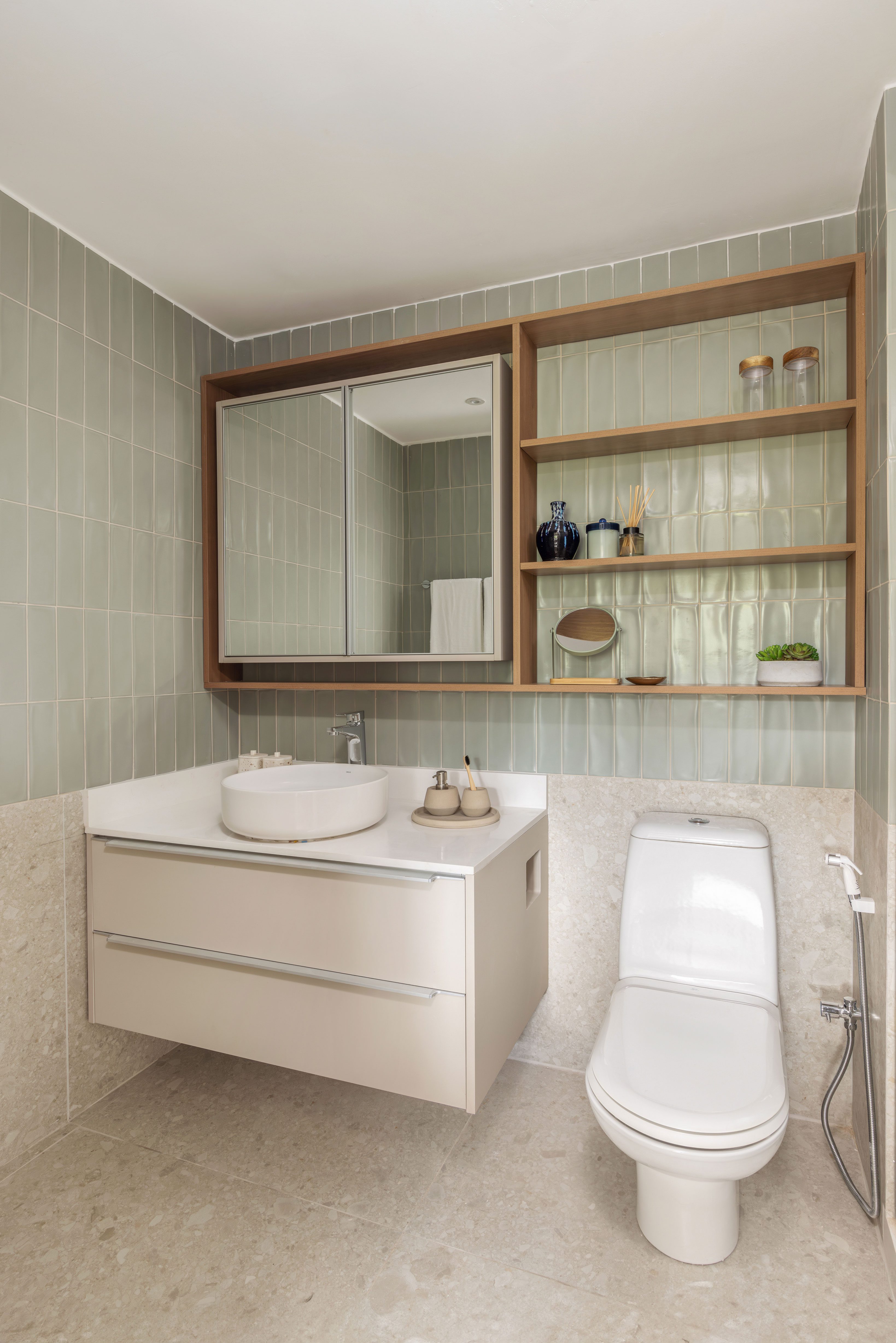 To harmonize with the other design choices, the color palette—composed of beiges, soft greens, and terracotta—enhances the overall sense of well-being. The flooring throughout the apartment is Caminho SGR Natural by Portinari, present in every room. In the ensuite bathroom, it extends halfway up the wall, sharing space with the ceramic tiles Miscelânea, Vivan Sauge, and Ligne Sauge, also by Portinari.