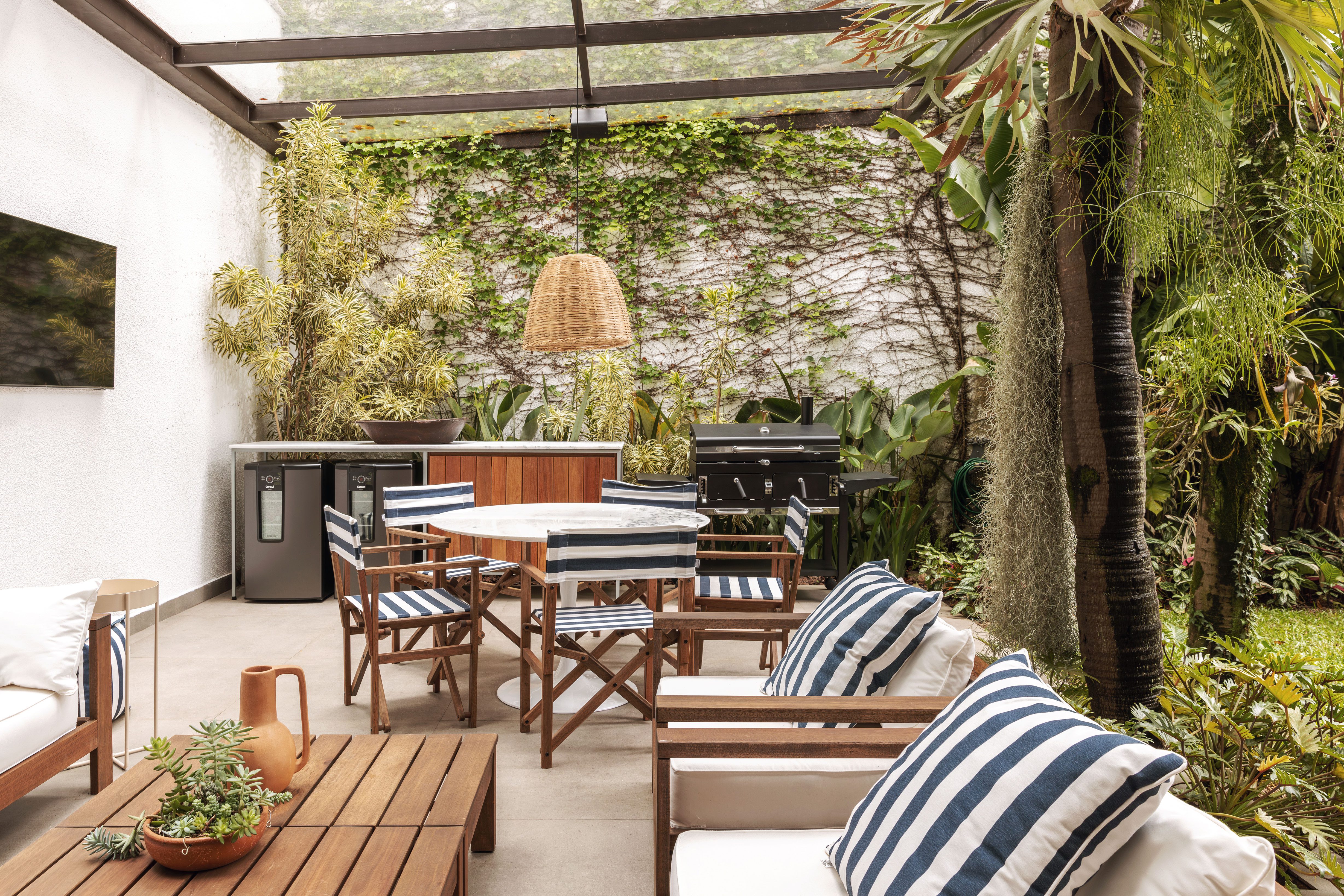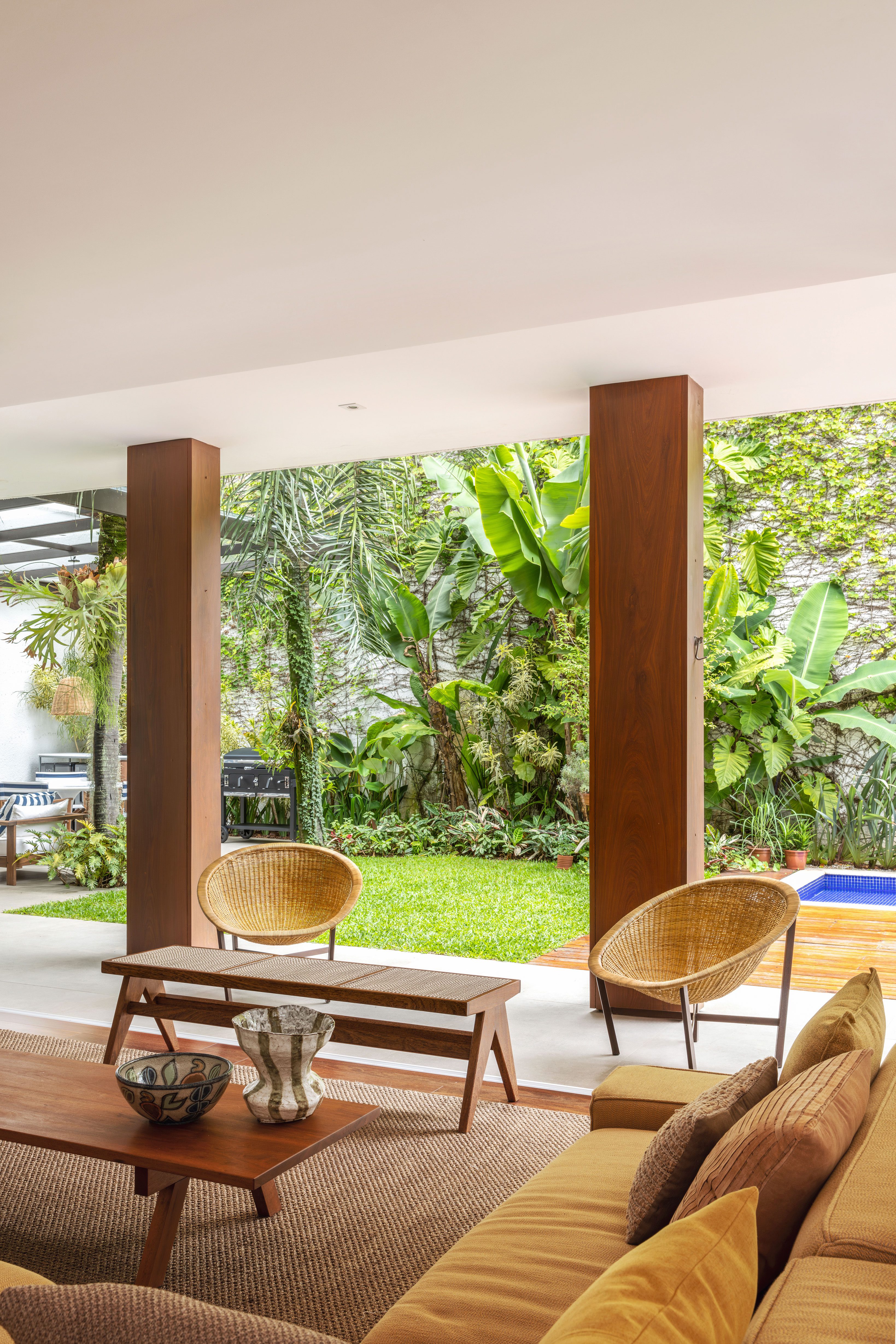 The living room, facing the outdoor area, connects to nature and integrates the entire social area. The Fofo H400 sofa and the Guaruçá armchair, by Líder, the latter designed by Mauricio Arruda, are key pieces to enhance the volume of the space.