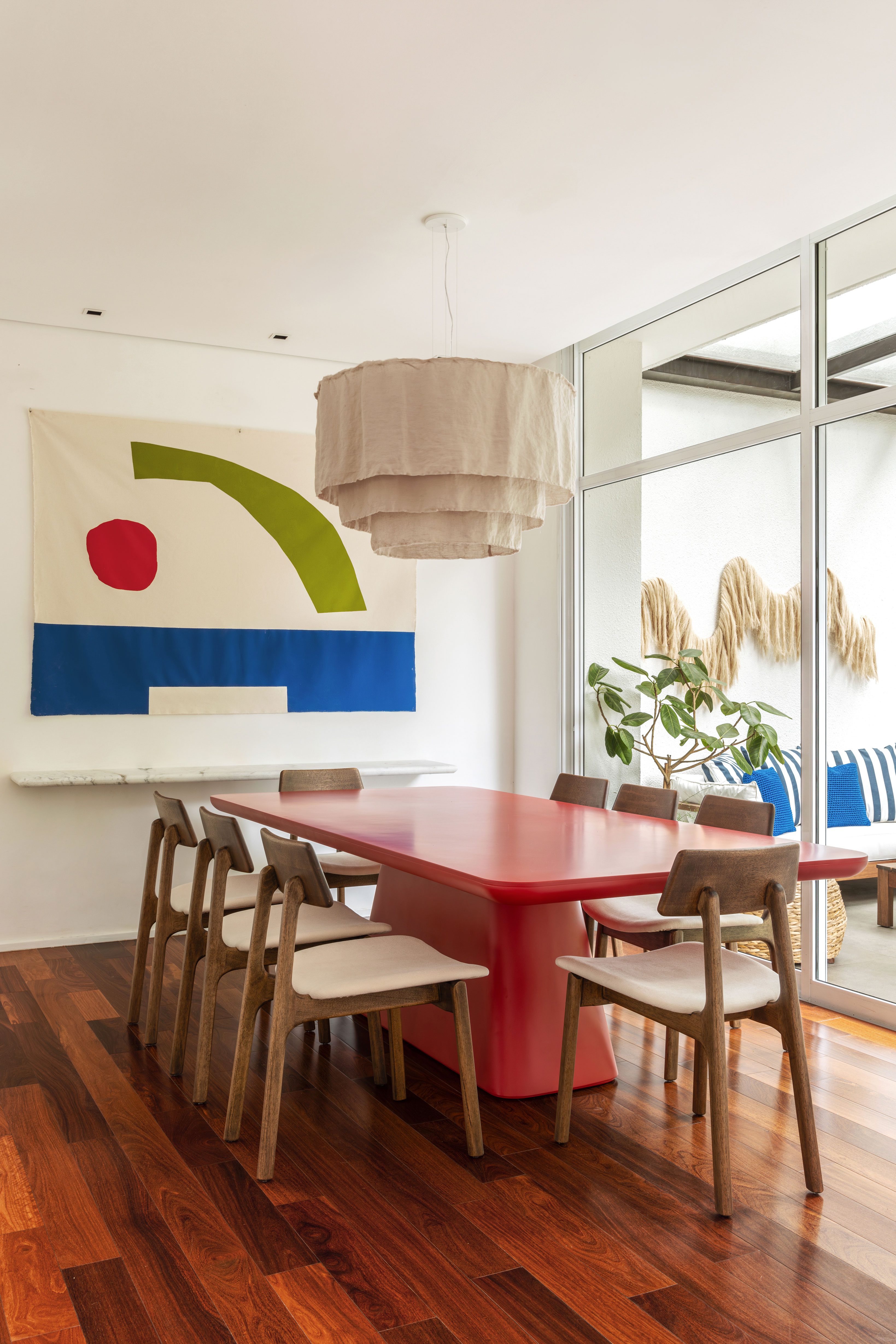 In the gourmet area, we prioritized practicality and functionality, creating a space for meals and social gatherings. Right next to it, integrated by glass doors, is the dining room. The environment is marked by the Acítara pendant lamp, made with three layers of linen, designed by designer Cris Bertolucci, and the Sense dining table with a red lacquer finish, by Líder, a memorable and impactful combination – as requested by the clients.