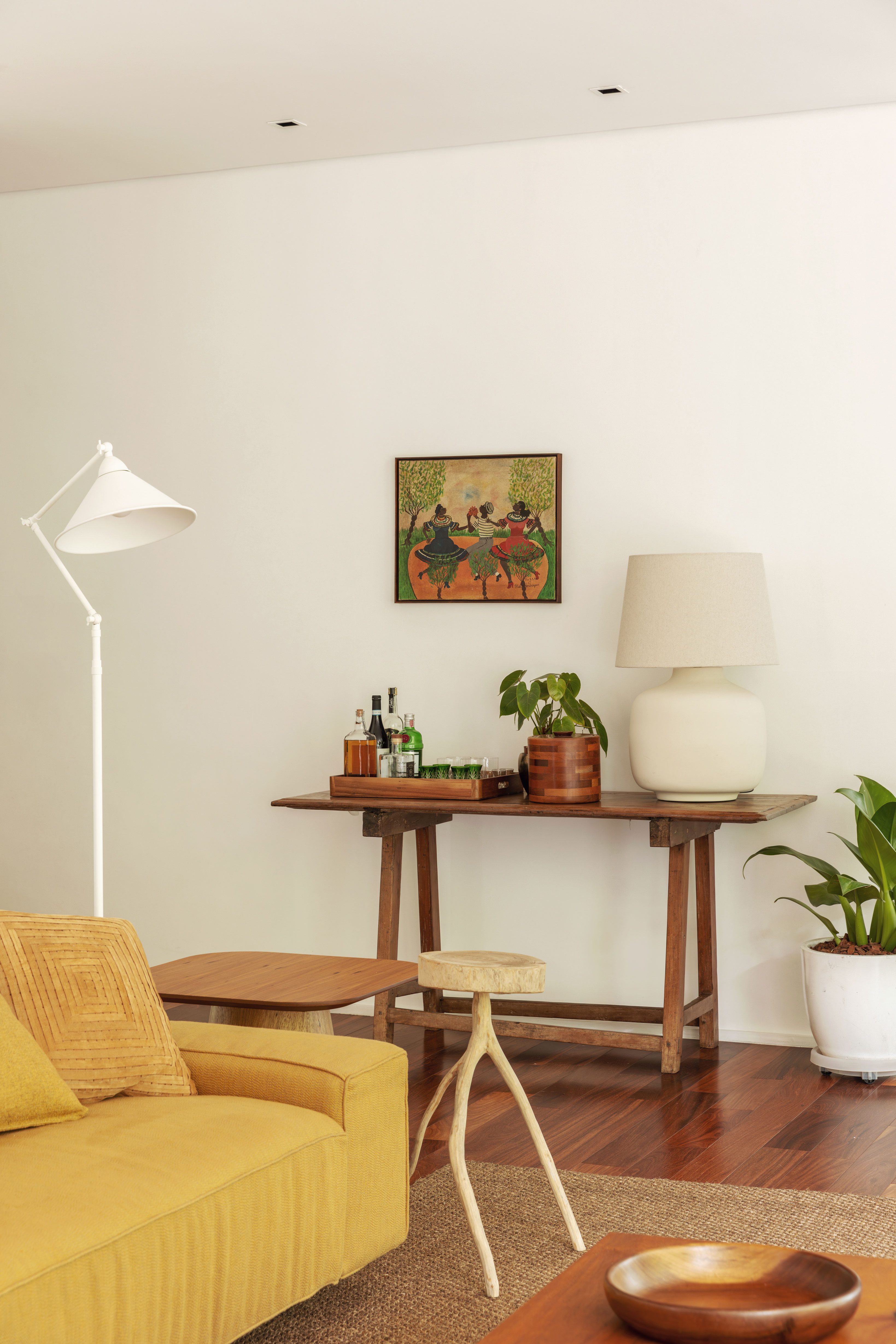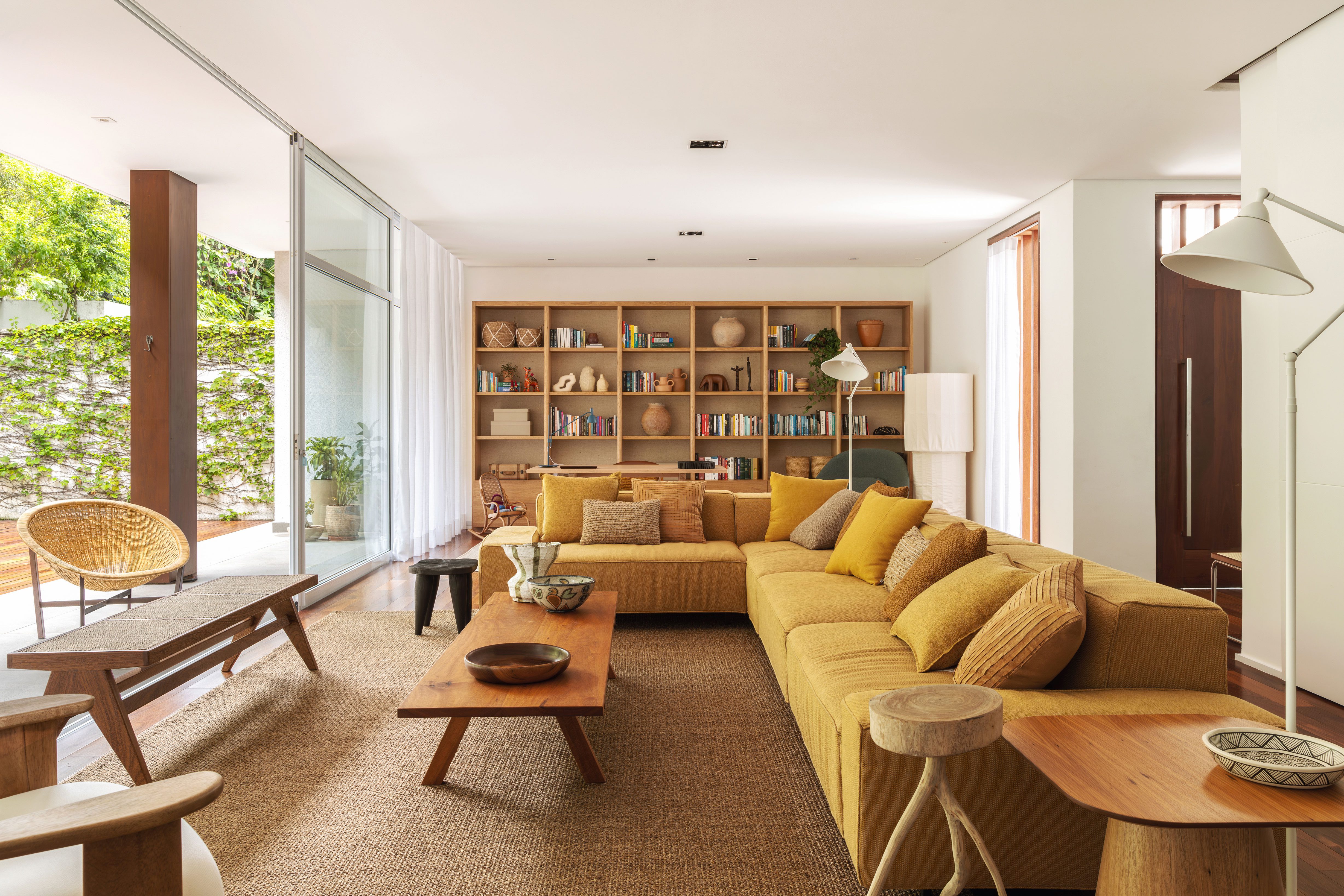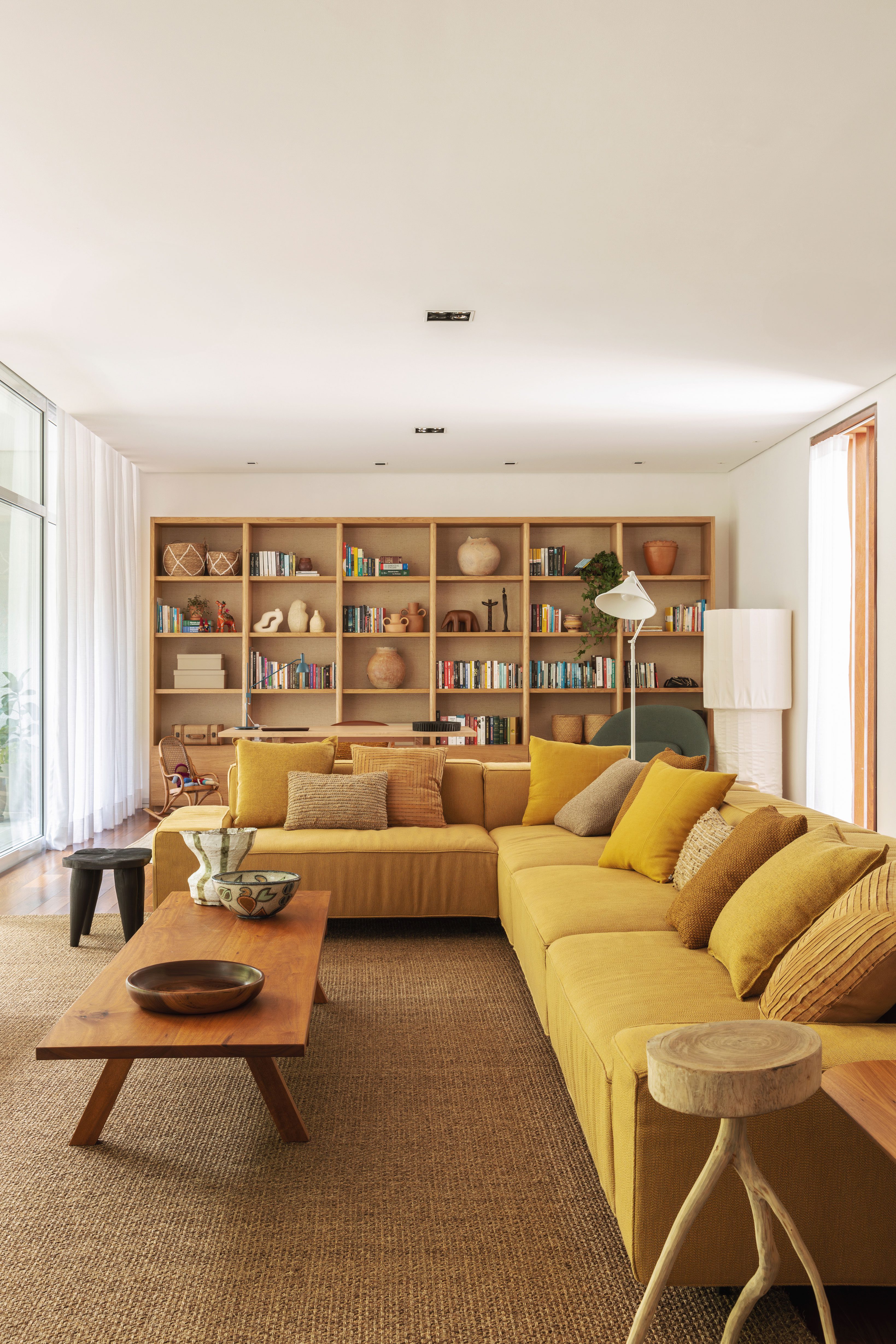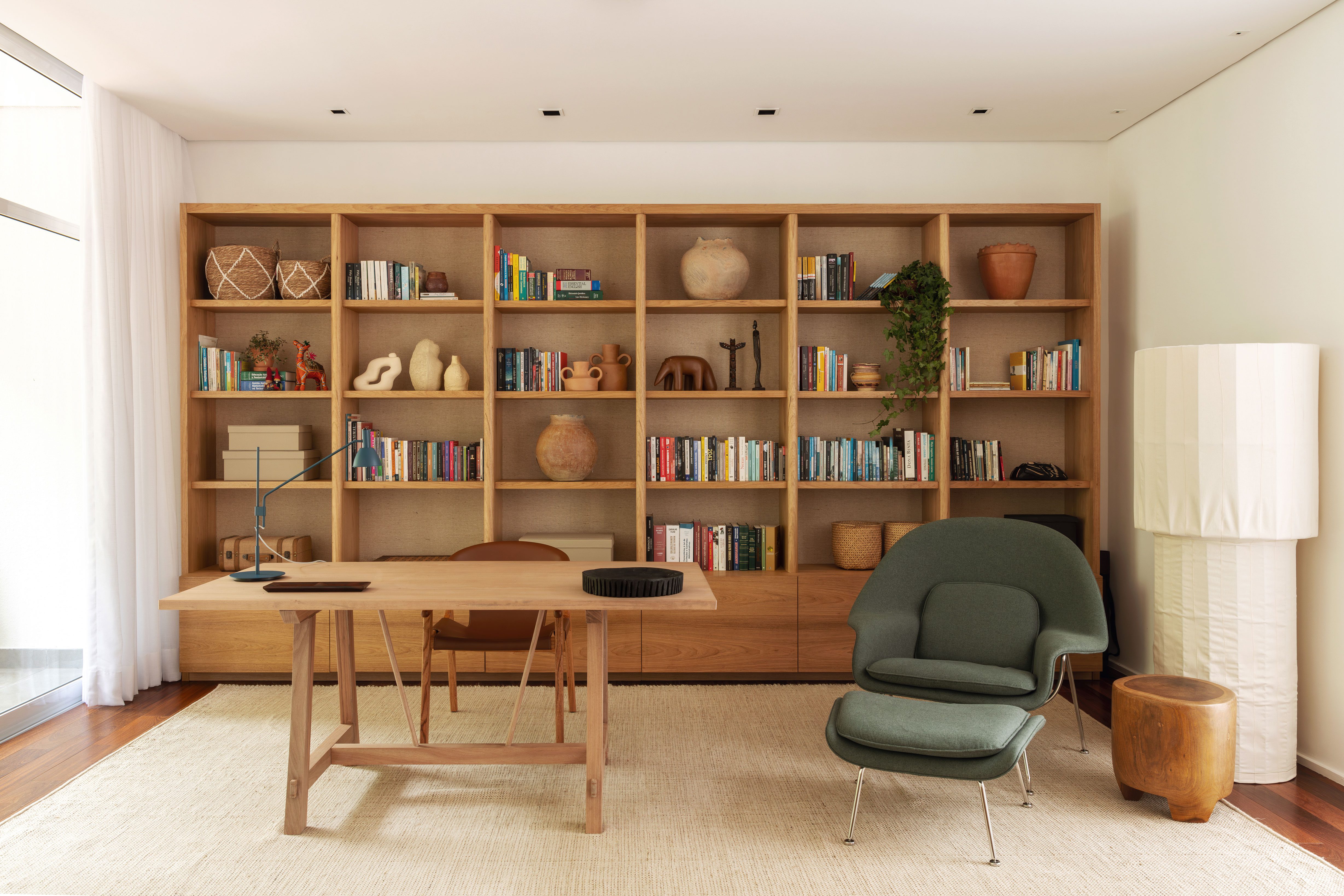 The home office is marked by the bookcase designed exclusively for the project. The piece of furniture made of natural freijó wood and straw was designed to meet the needs of a versatile environment, ideal for both crafts and work, without isolating family life, as it is integrated into the living room.