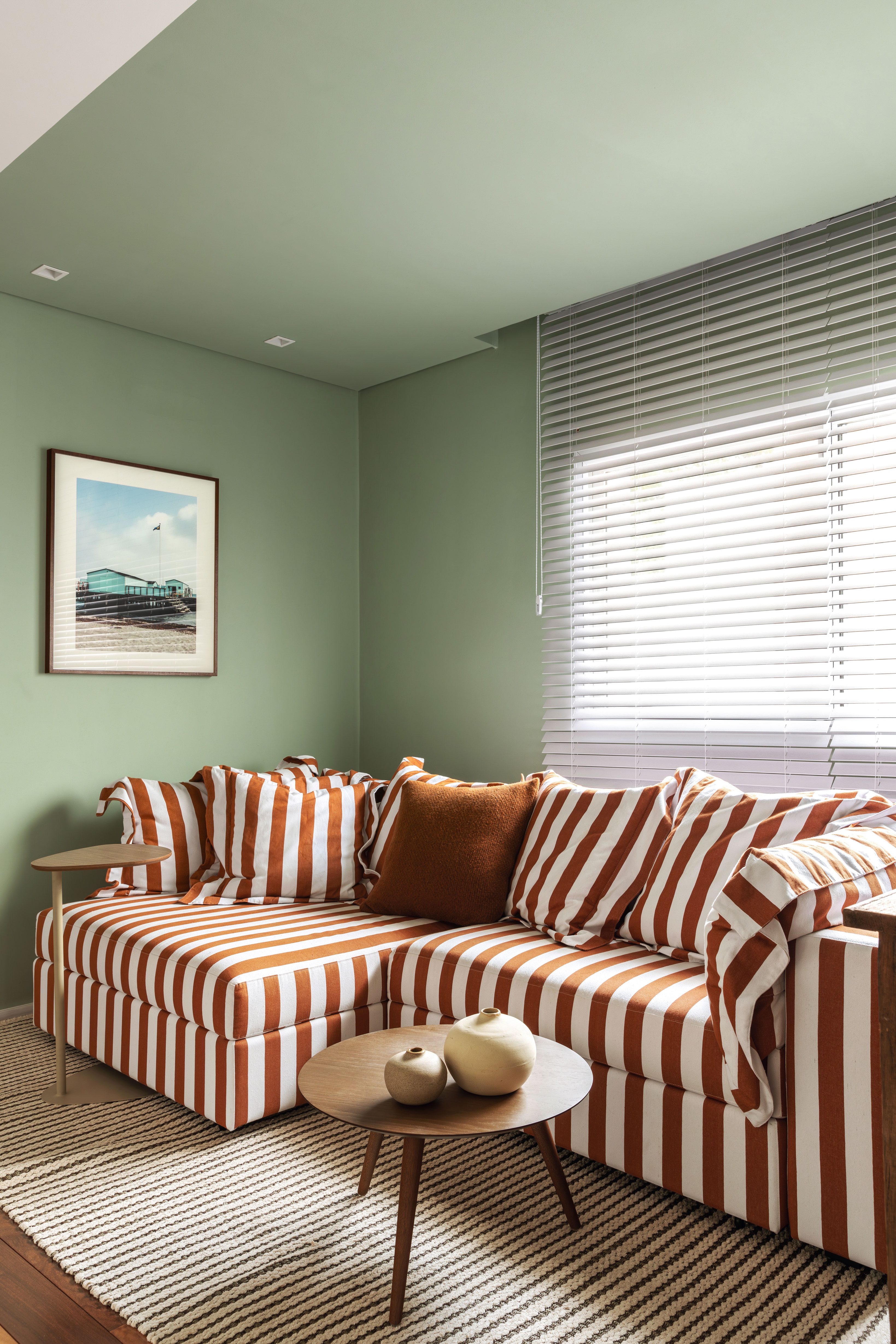 On the second floor, the TV room came alive with walls in the Natural Stone color, by Tintas Coral, and with the sofa upholstered with terracotta striped fabric, by Eco Simple, designed by Mauricio Arruda.