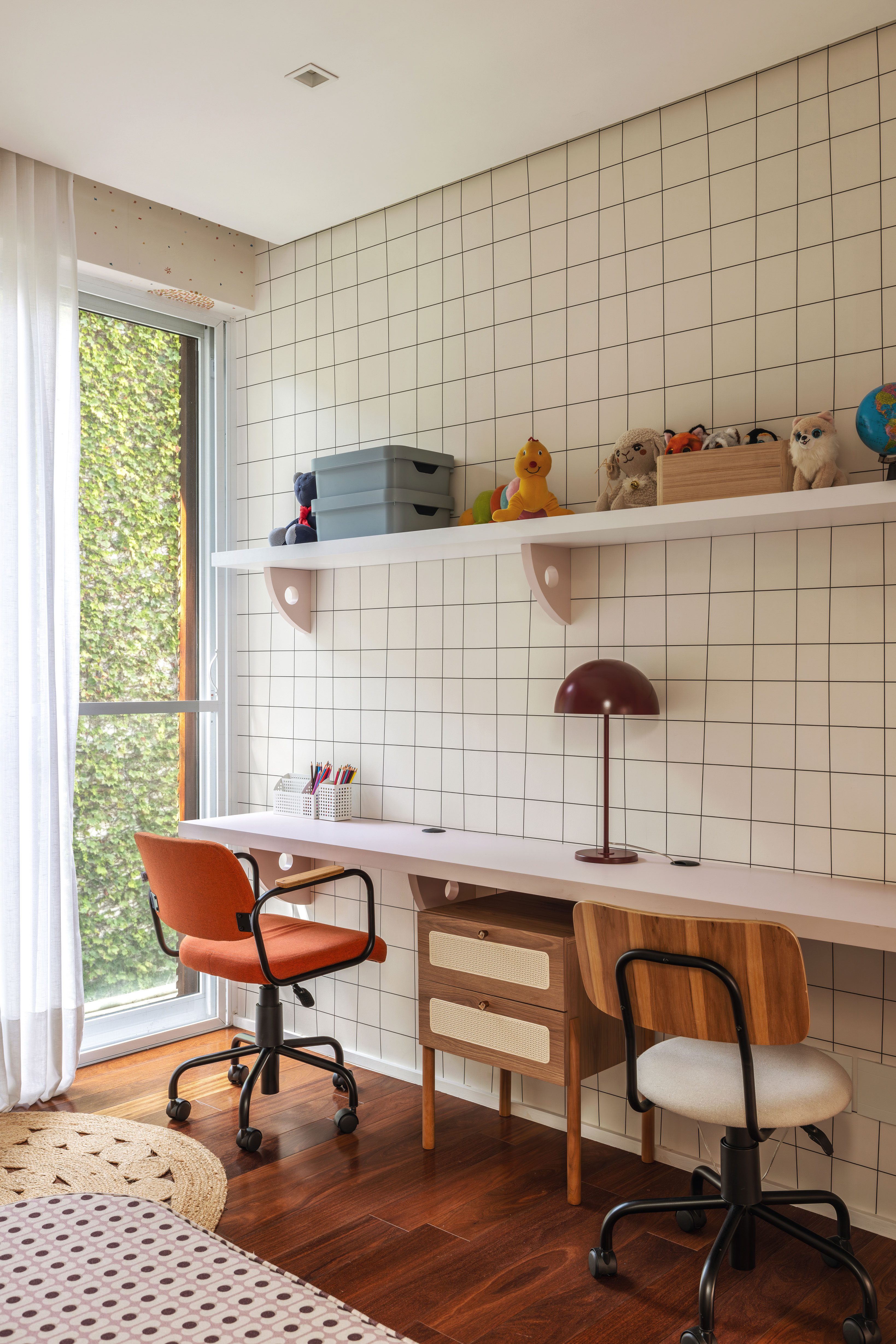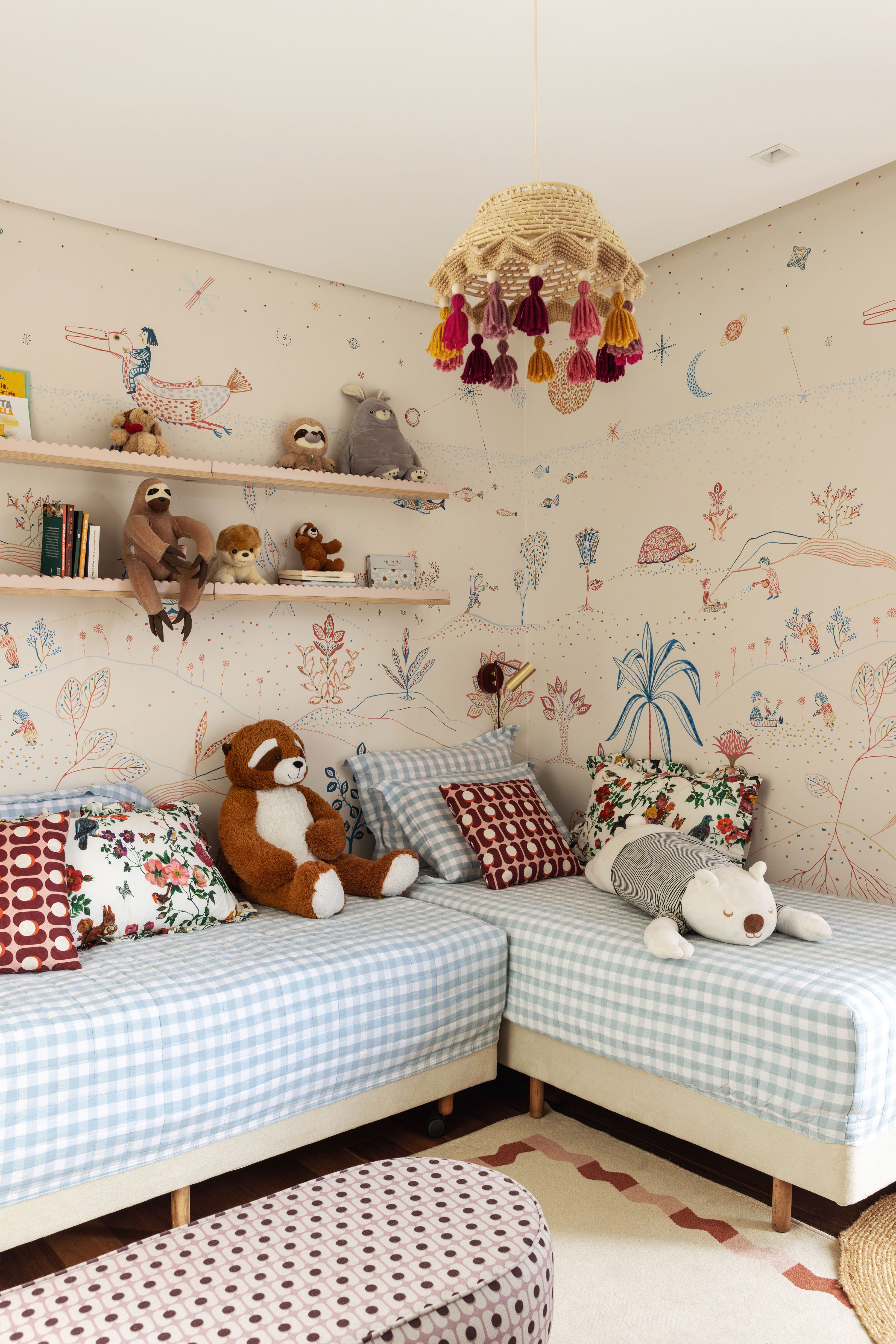With floral wallpaper and a palette in shades of pink, the girls’ room, for 6 and 8-year-olds, has a playful theme but can be easily adapted to accompany the children’s growth.