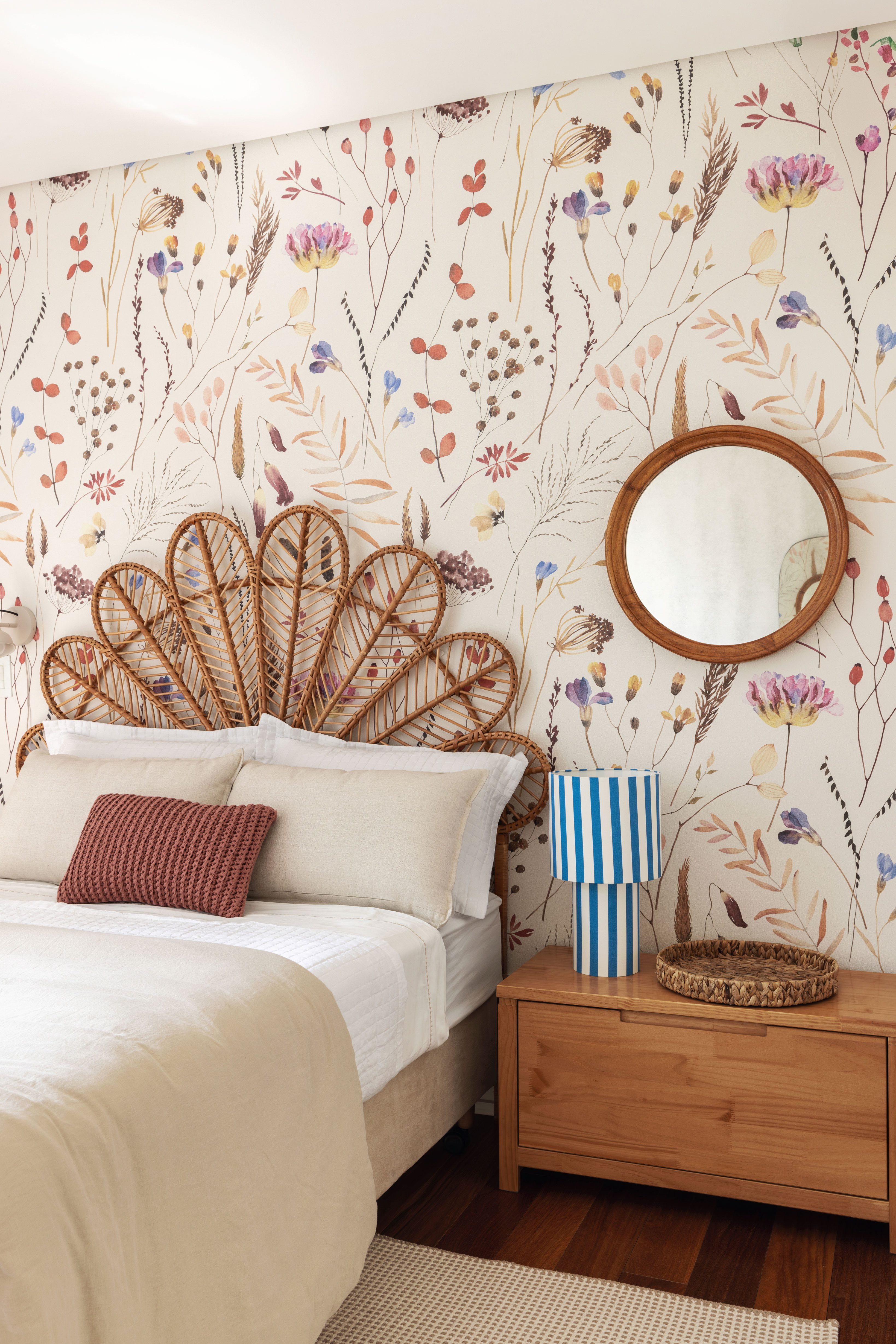 The oldest daughter’s room, 13 years old, has a mystical and boho atmosphere, marked by more sober colors, which reflect her personality. Highlights include the Flor headboard, by Casa Cahaya, and the Praia lamp, by MAU.