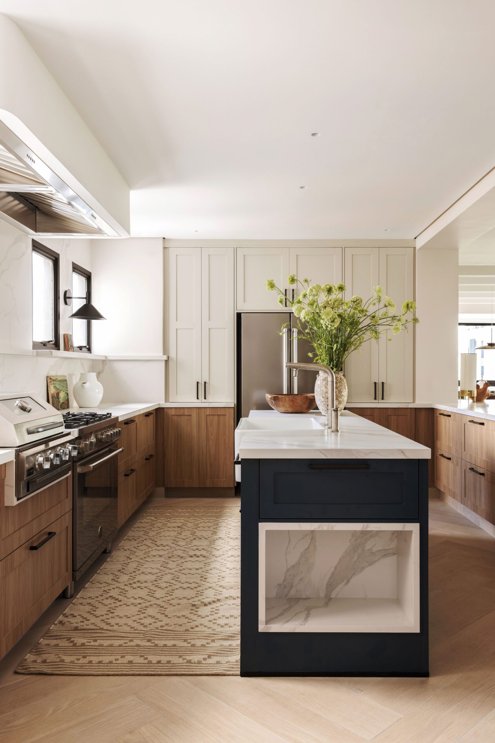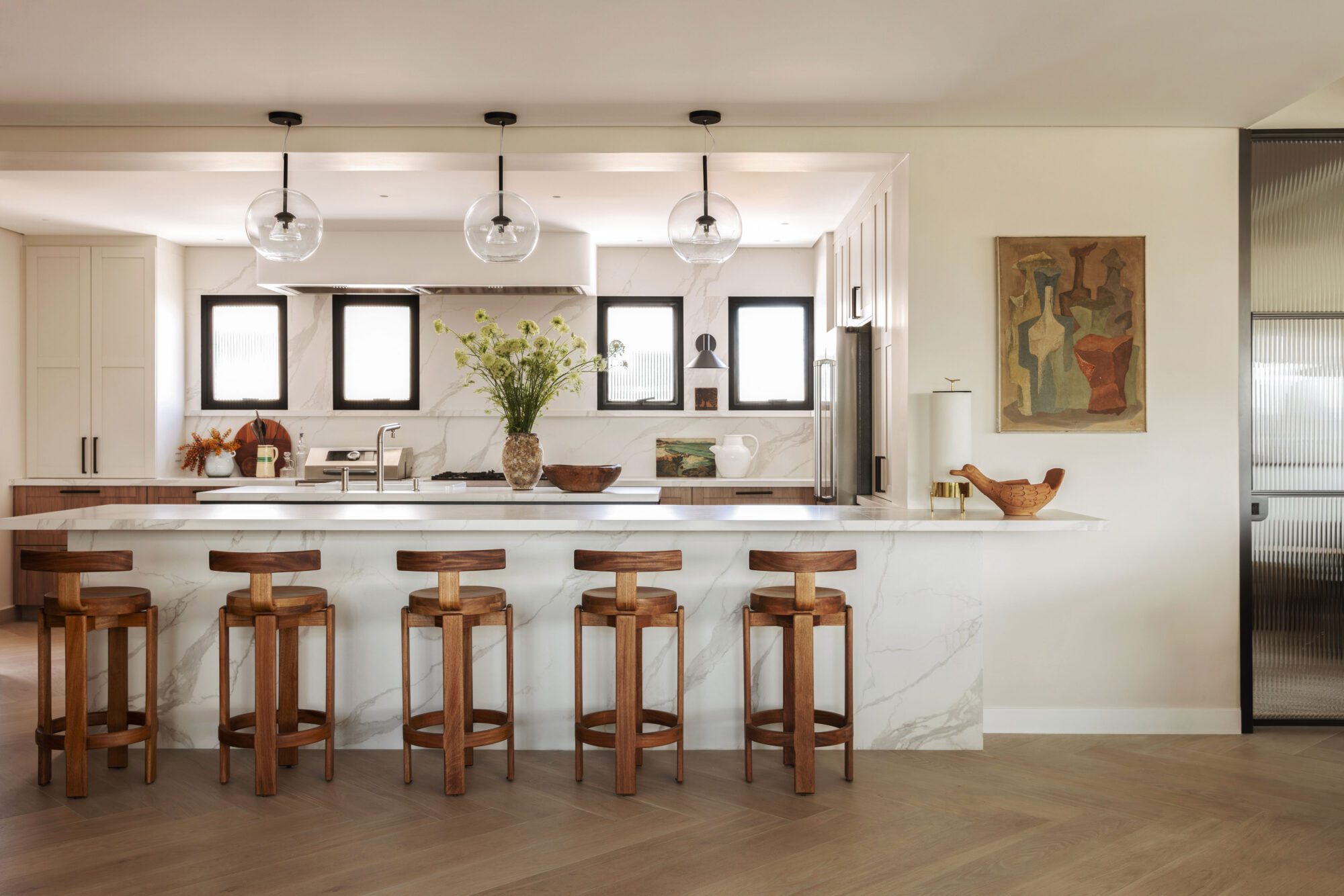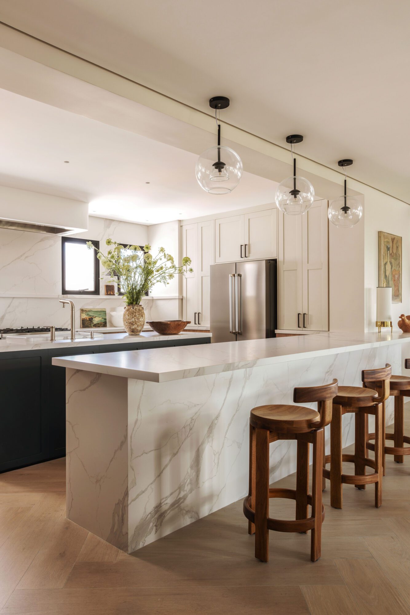A cozinha foi posicionada de forma estratégica para se conectar à área social sem perder sua funcionalidade. O ambiente foi planejado com grande variedade de soluções de armazenamento e superfícies resistentes, com bancadas de pedra sinterizada padrão mármore. Equipamentos como fogão, churrasqueira e coifa reforçam o caráter funcional do espaço e sua relação direta com o ato de cozinhar e receber. Inclusive, a disposição dos armários e bancadas foi idealizada para otimizar fluxos e garantir praticidade no dia a dia.