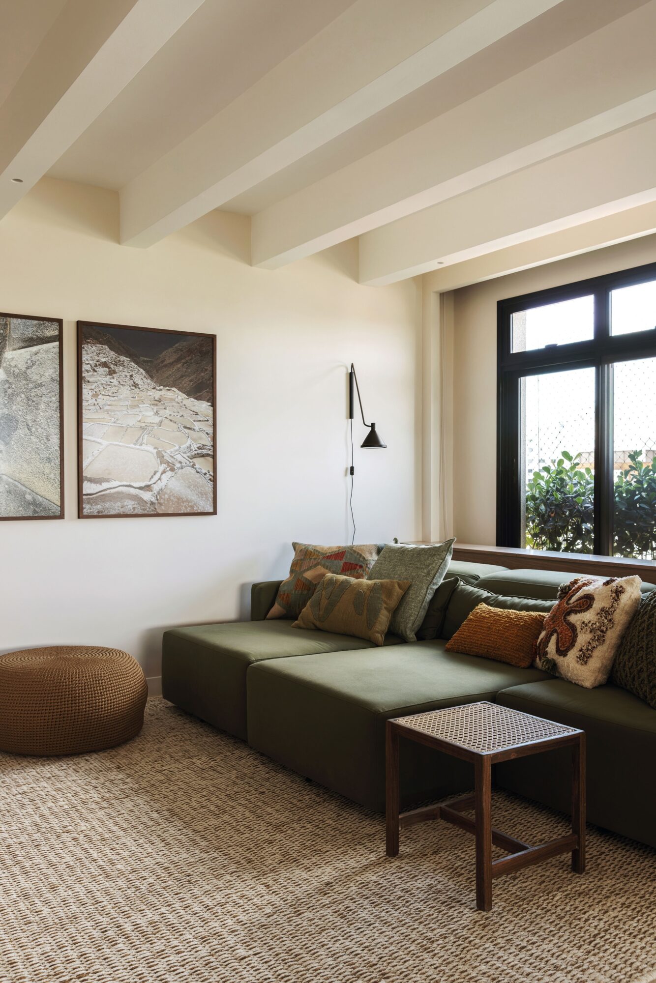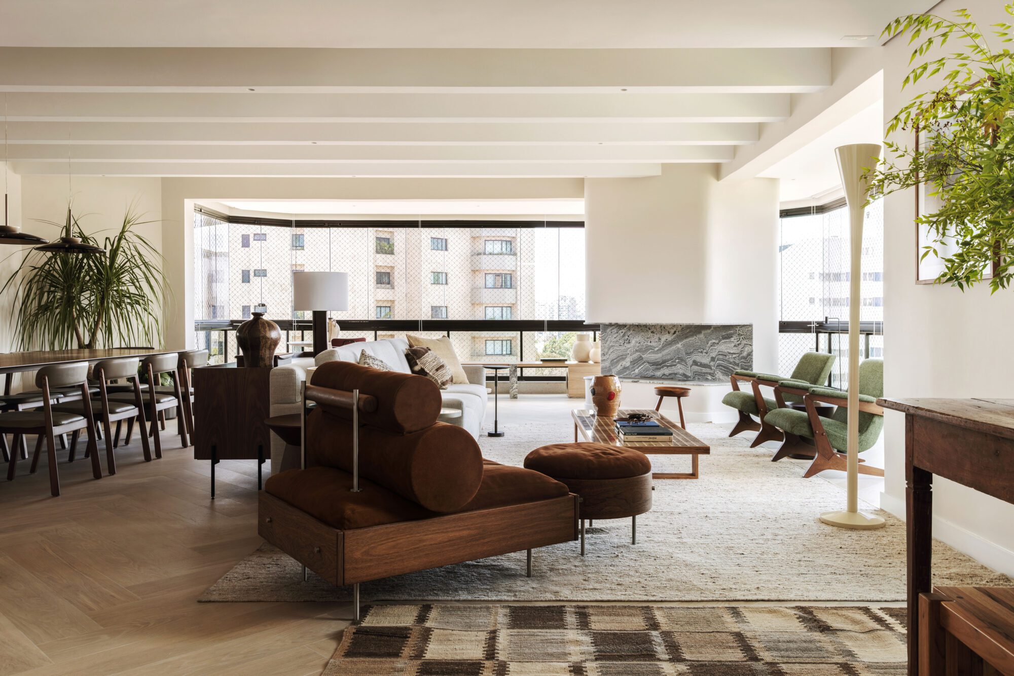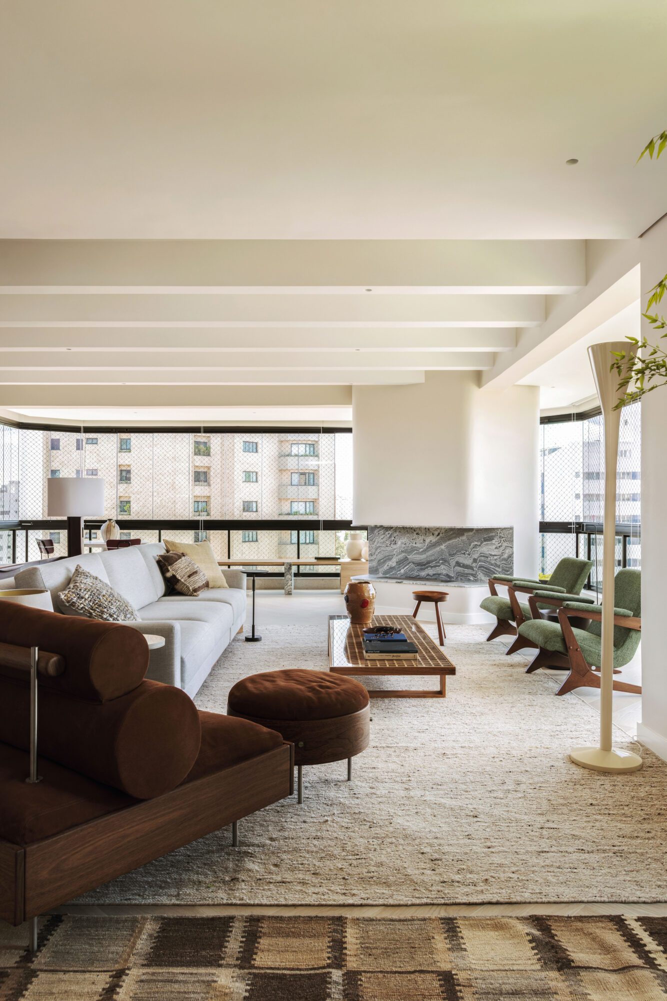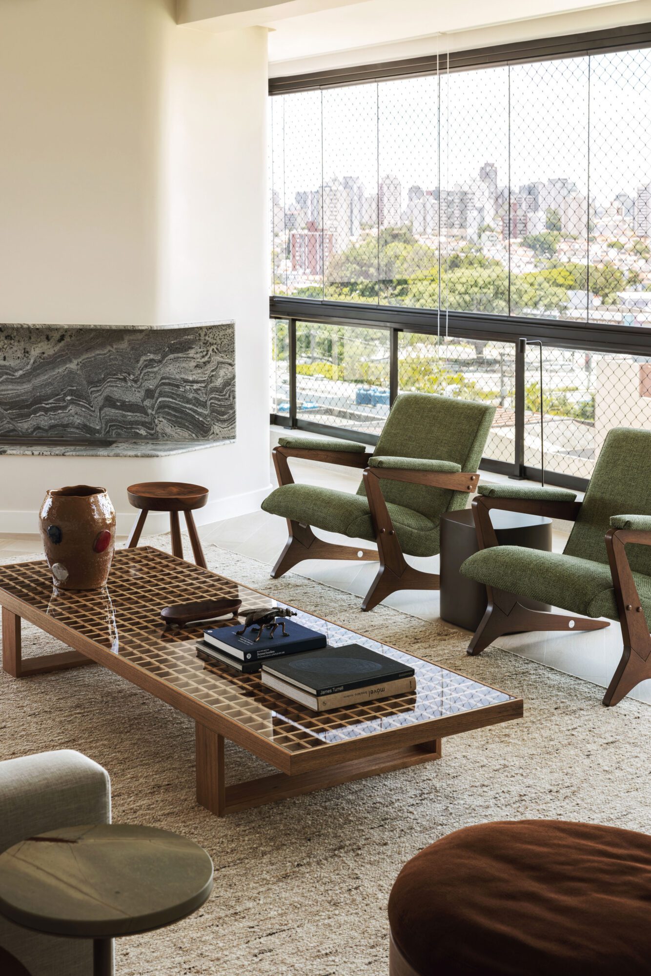 Na área social, o mobiliário foi selecionado para equilibrar peças contemporâneas e elementos cheios de história. Móveis antigos foram incorporados à composição, contribuindo para criar camadas de memória e evitar a sensação de um ambiente excessivamente novo ou impessoal. A curadoria das peças buscou estabelecer diálogo entre proporção, desenho e materialidade.