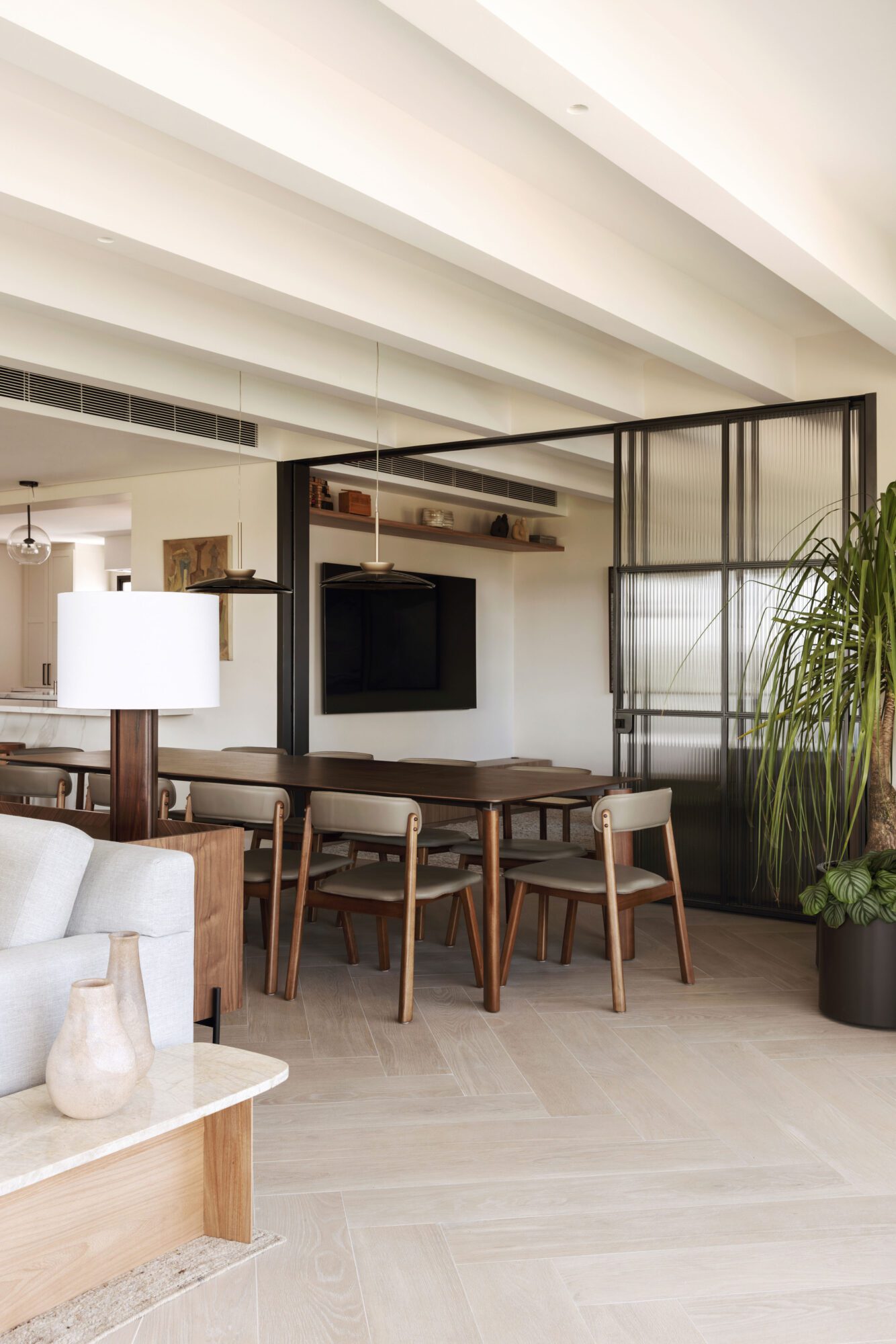 O piso desempenha também papel importante na leitura espacial do apartamento. Inspirado nas referências trazidas pelos moradores, que buscavam uma atmosfera de “fazenda moderna”, foi adotado um porcelanato que reproduz madeira natural. O material foi aplicado no padrão espinha de peixe, criando movimento e contribuindo para a delimitação sutil das áreas dentro do grande espaço integrado.