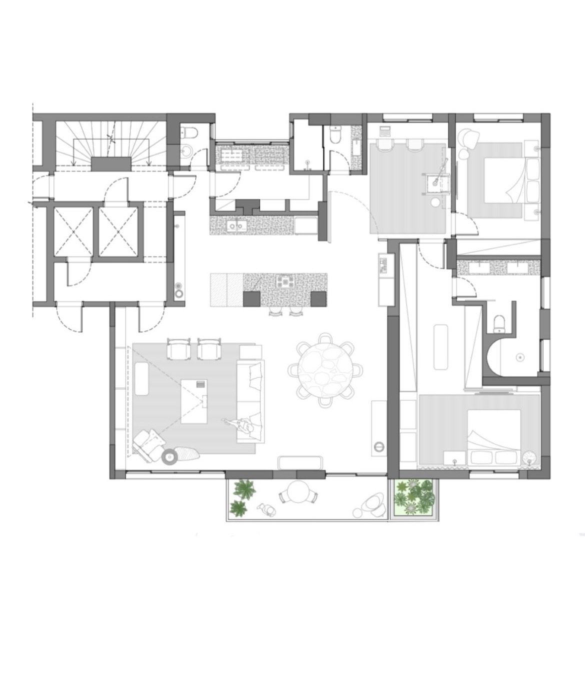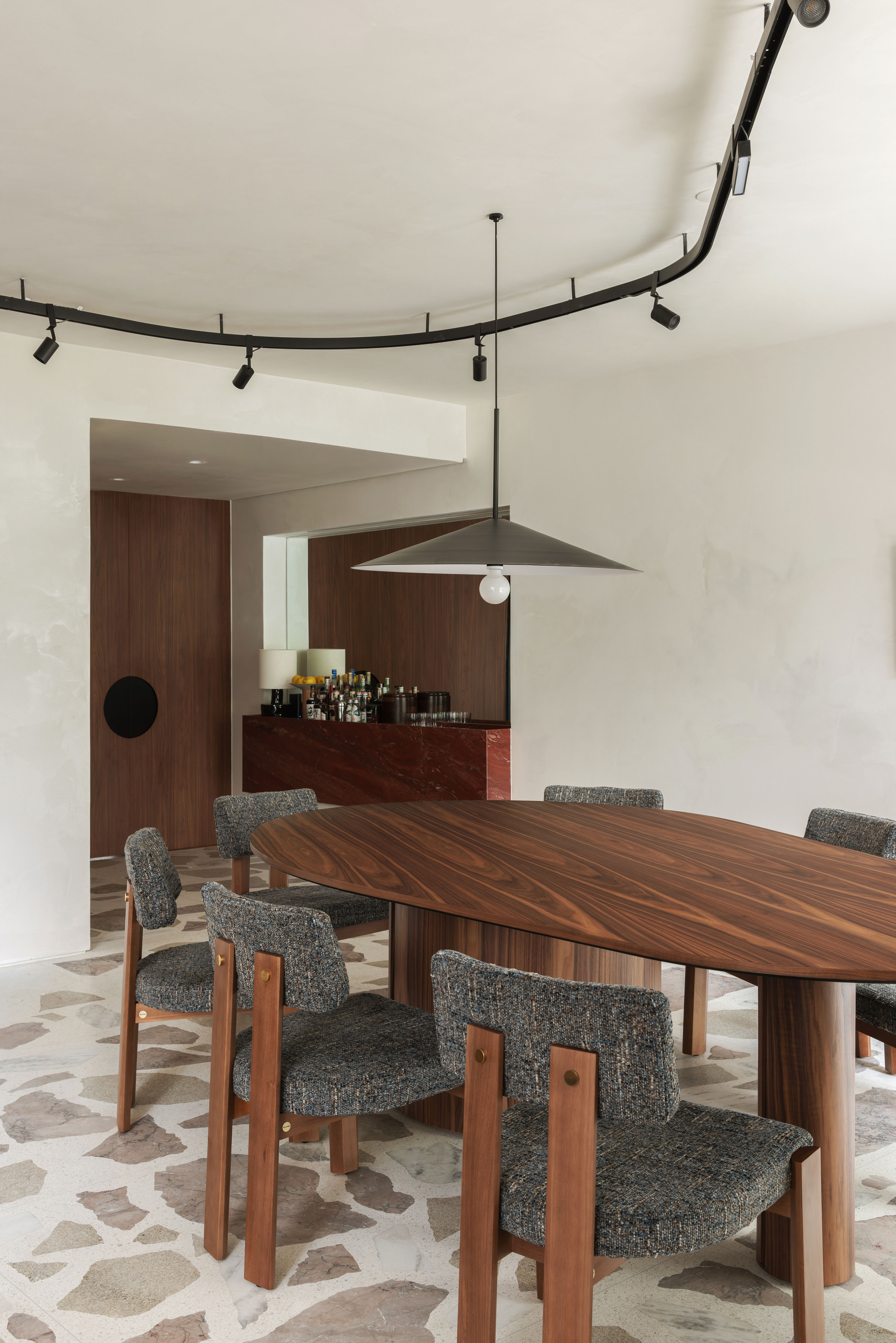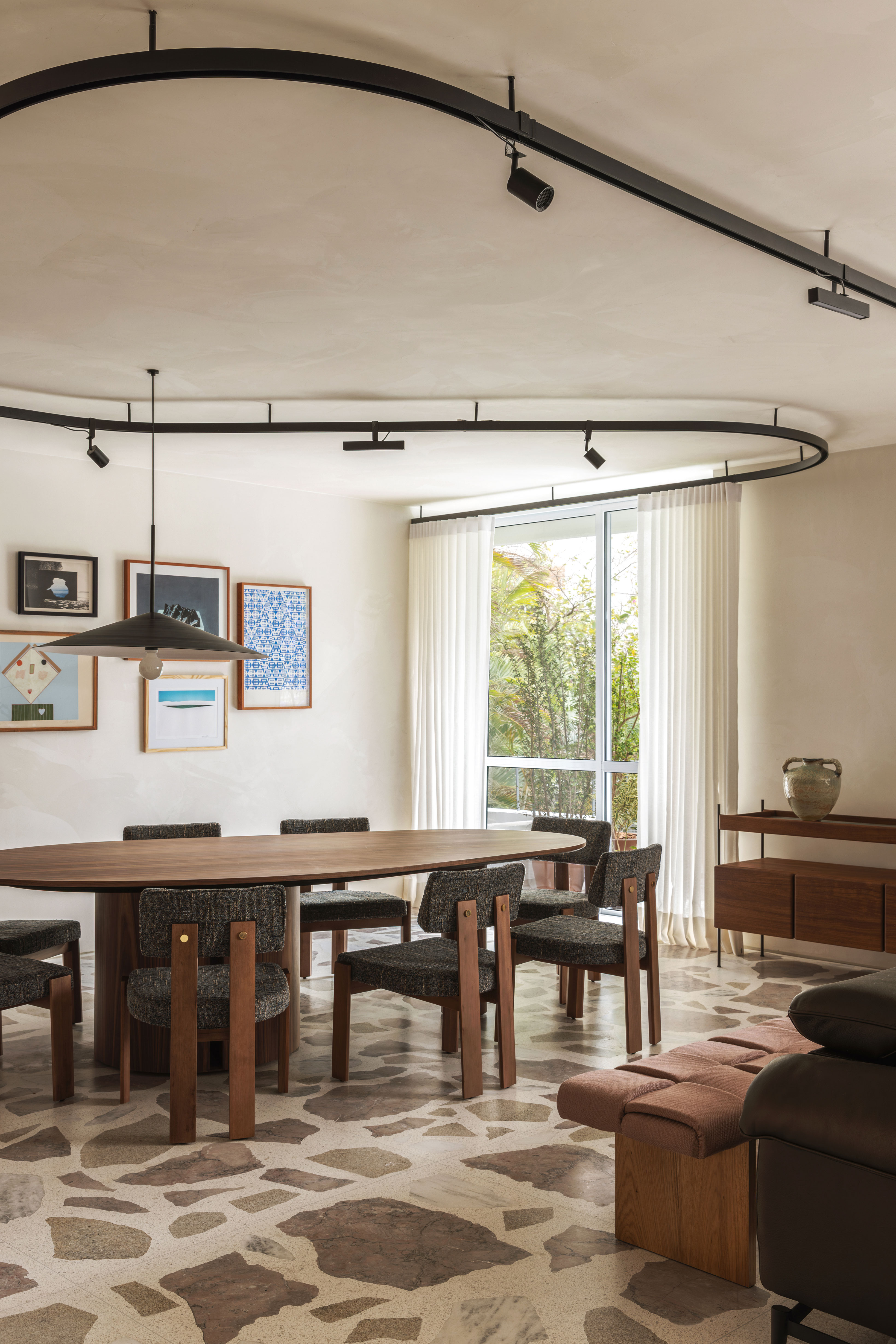 Para atender a esse desejo, o projeto buscou trazer amplitude a partir de um espaço integrado e multifuncional, no qual a fluidez entre os cômodos e a entrada abundante de iluminação natural se tornaram protagonistas. O piso, composto pela mistura de quatro pedras distintas entre argamassa e concreto, atua como elemento condutor do layout.