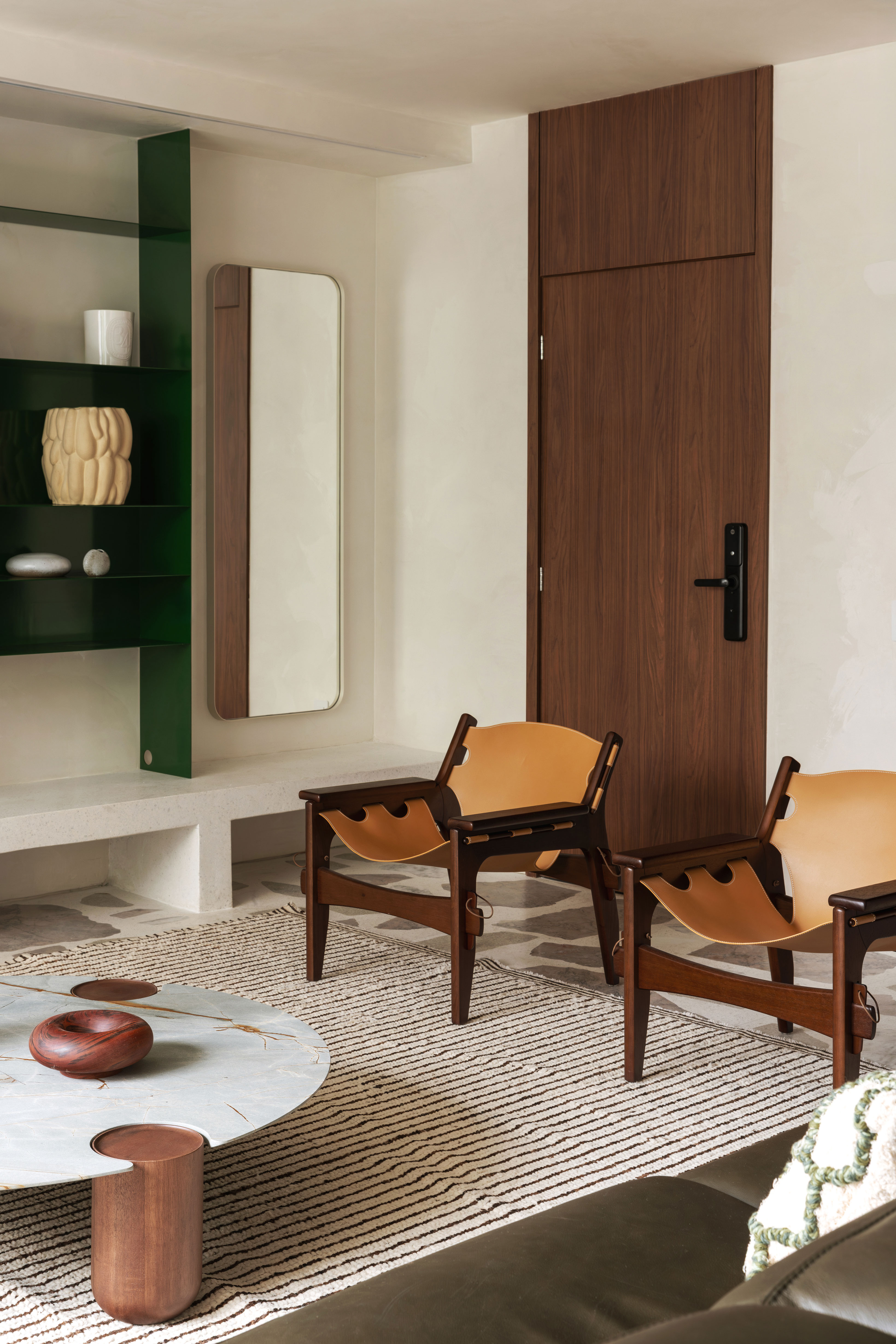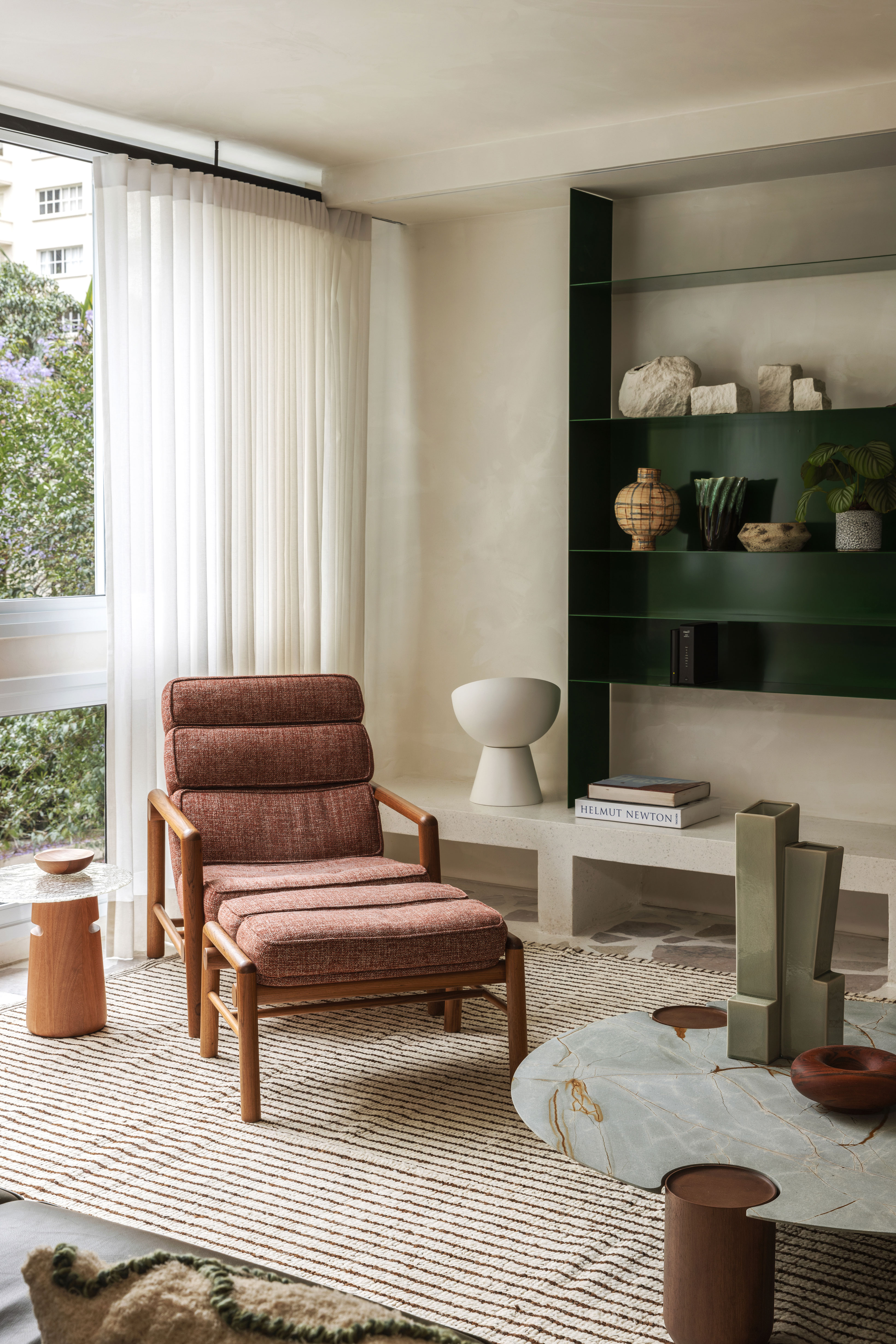 A curadoria de móveis e objetos do Apartamento Pernambuco buscou um diálogo entre o prédio modernista e as formas puras que refletem a essência do design contemporâneo