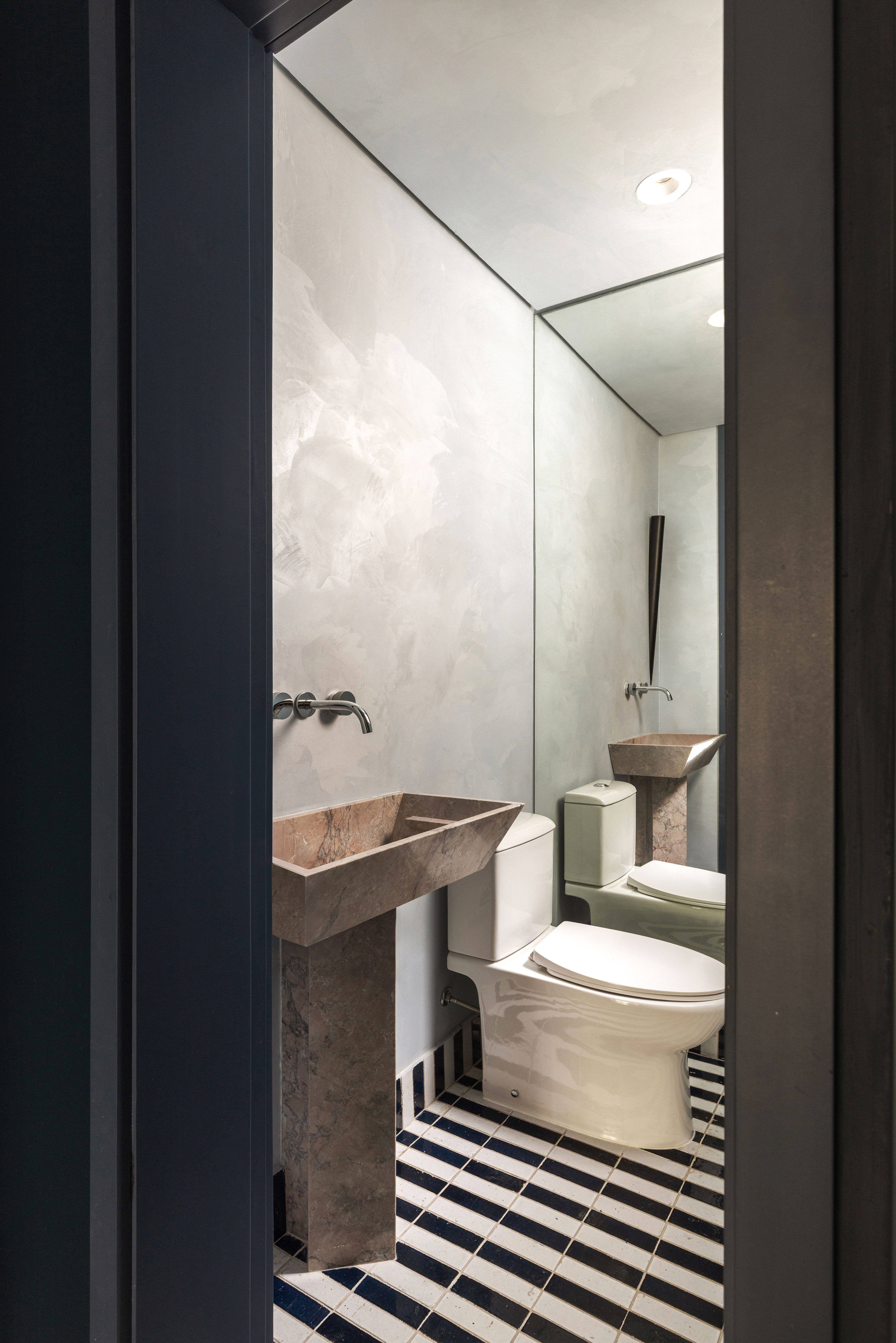 Ainda na área social, o lavabo abriga uma pedra pertencente à família dos clientes, que foi tratada e integrada ao projeto, agregando memória afetiva ao ambiente.