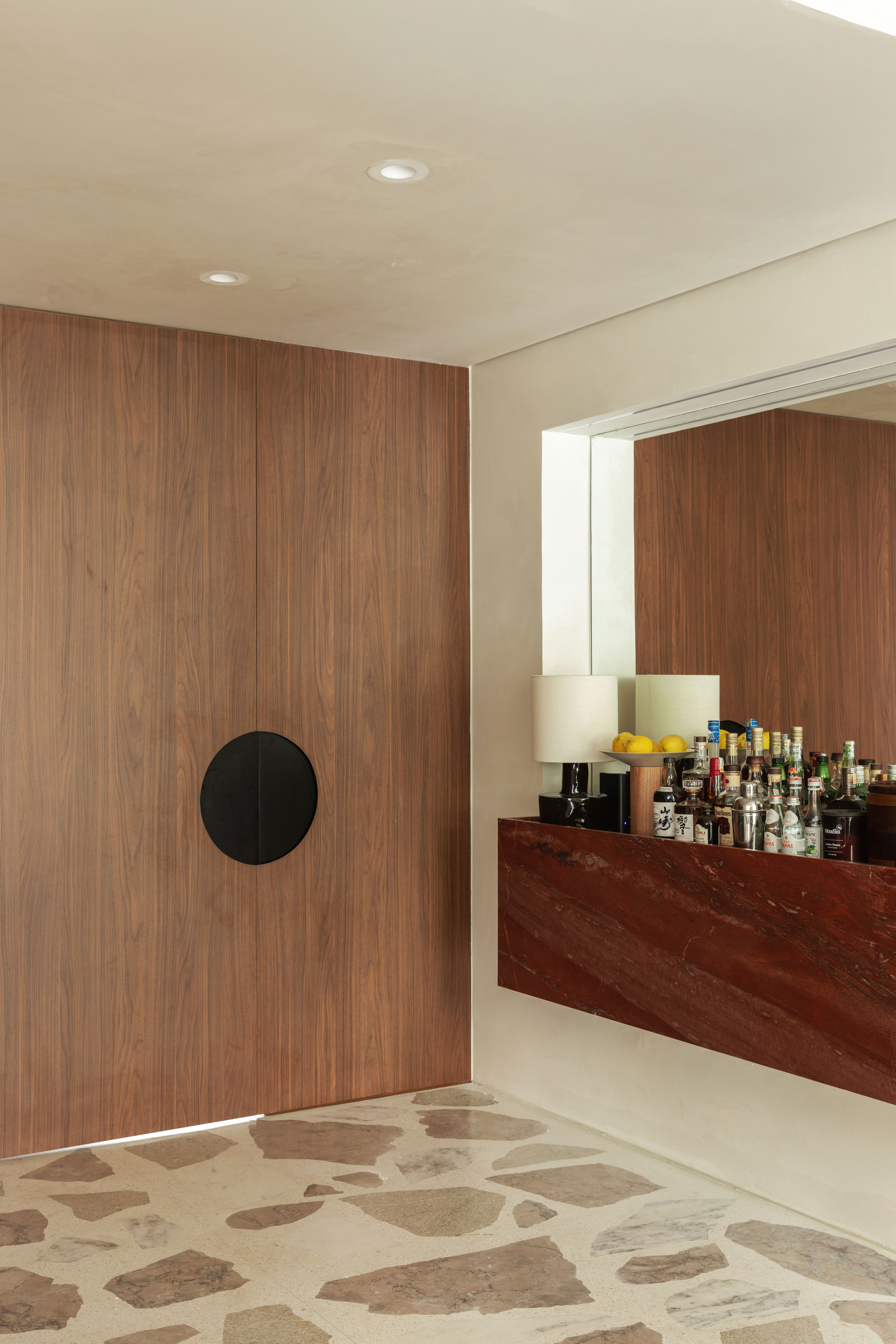 A área do bar reforça a vocação do apartamento para receber, funcionando como ponto de apoio tanto para o dia a dia quanto para ocasiões especiais.