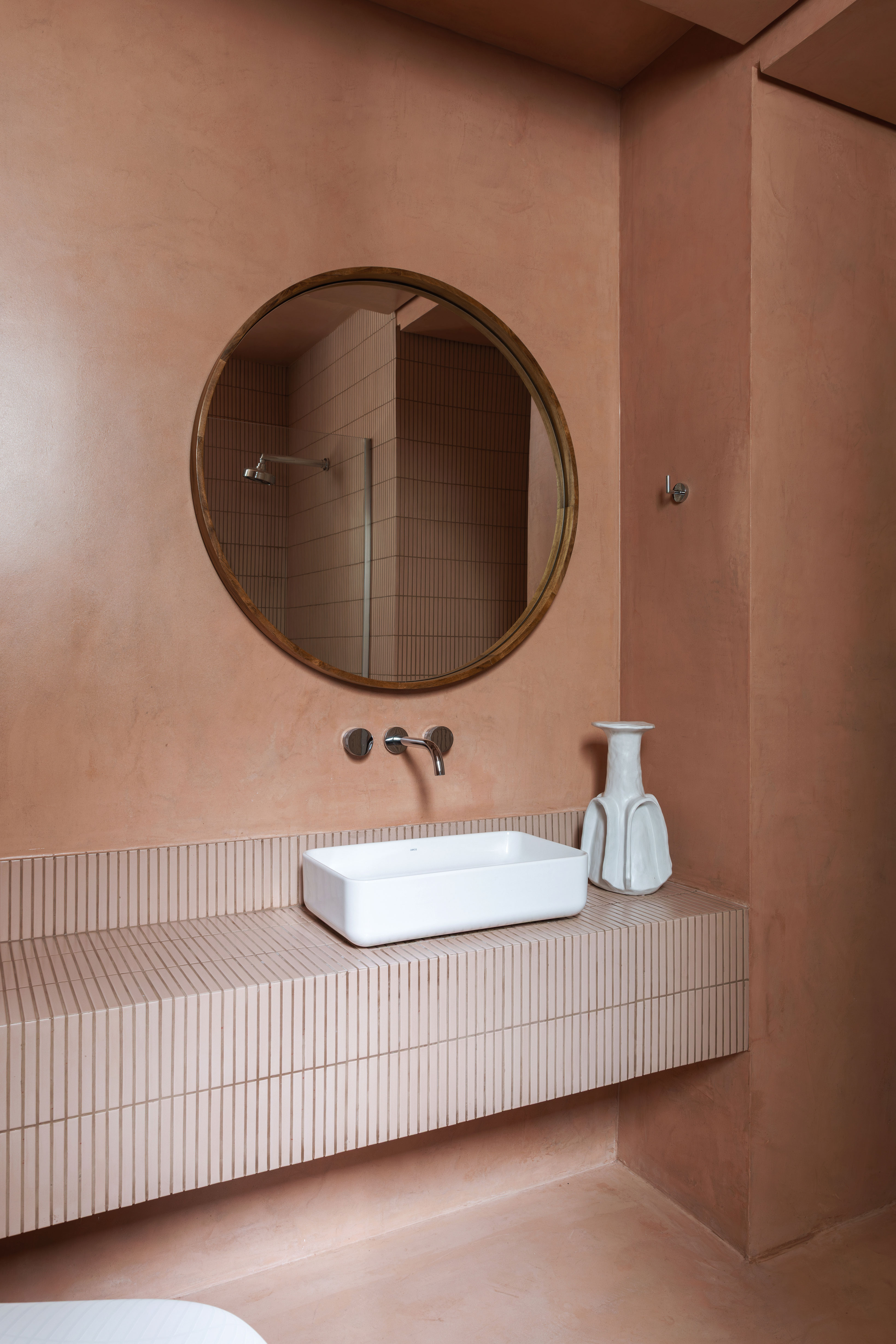 Na área íntima, o escritório ganhou personalidade com a presença de uma cortina colorida e foi complementado com uma bancada flutuante, trazendo leveza ao cômodo. O banheiro, em tons de rosa, foi executado com microcimento, material que também reveste a bancada.