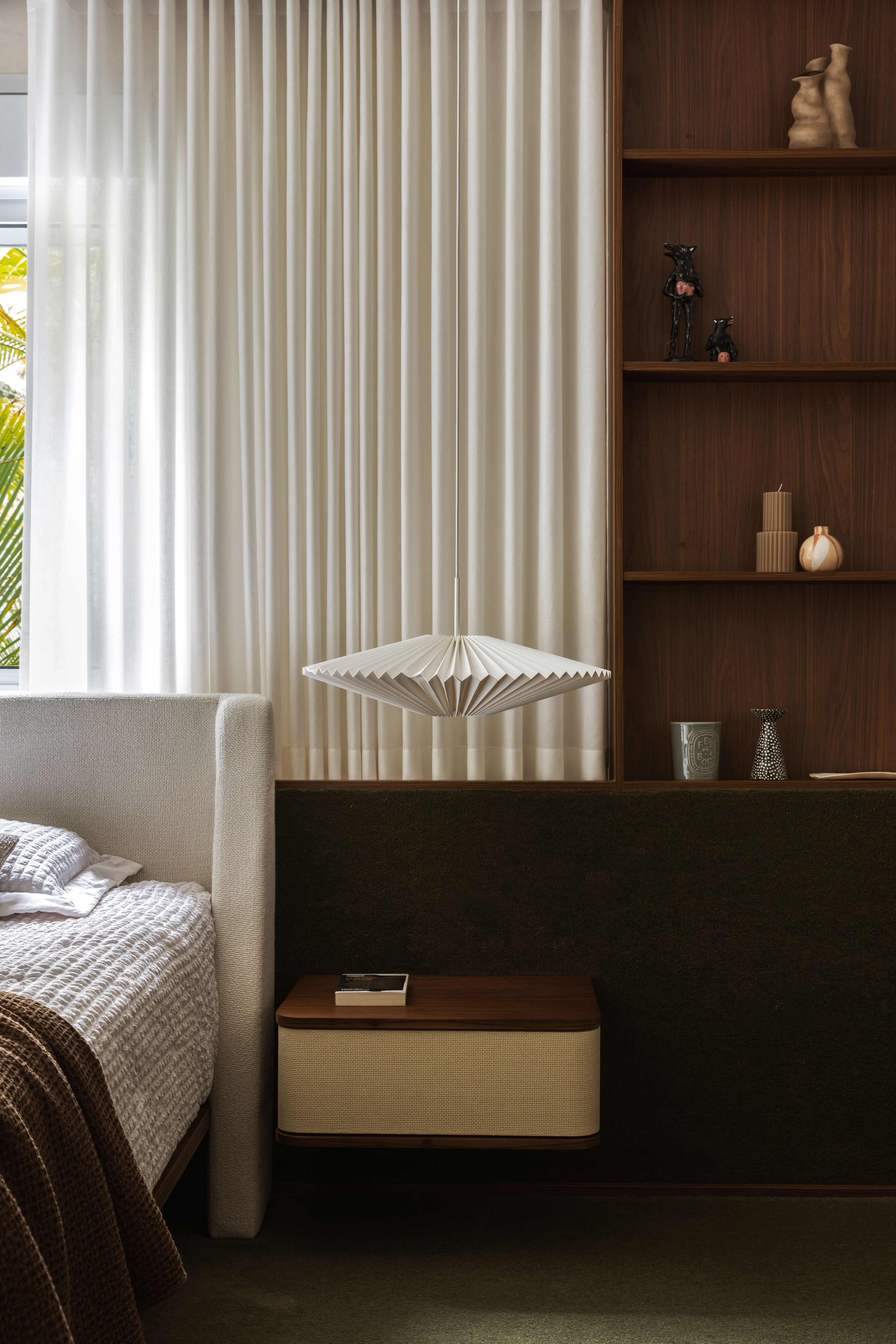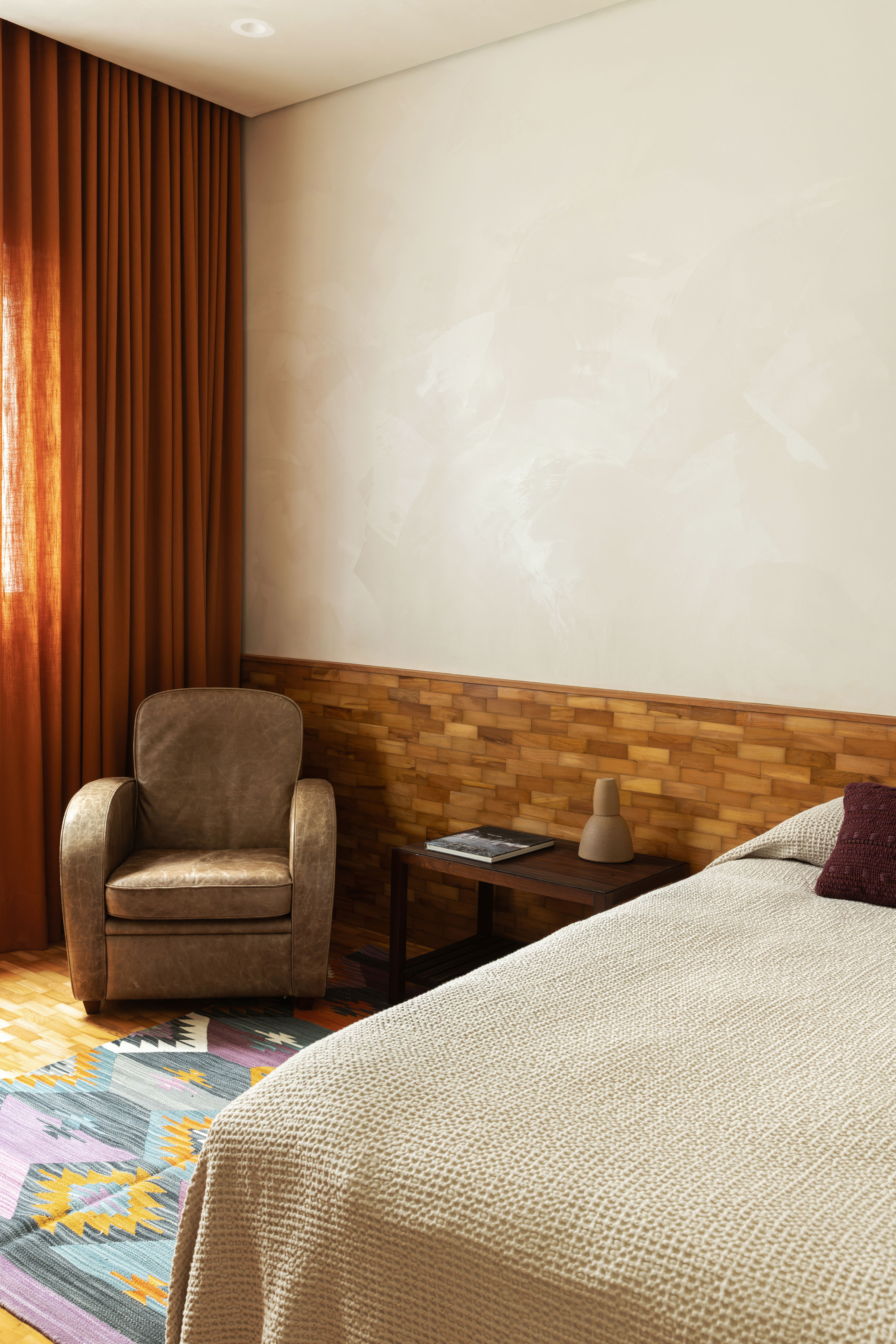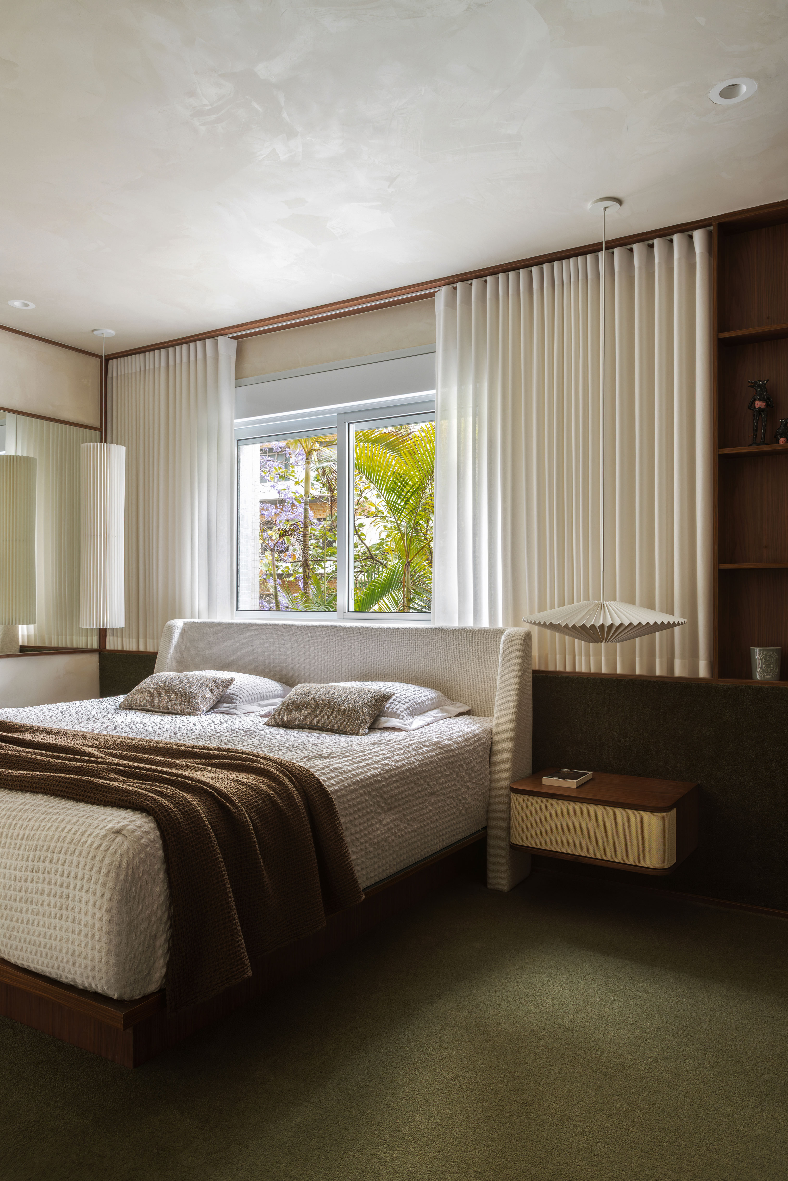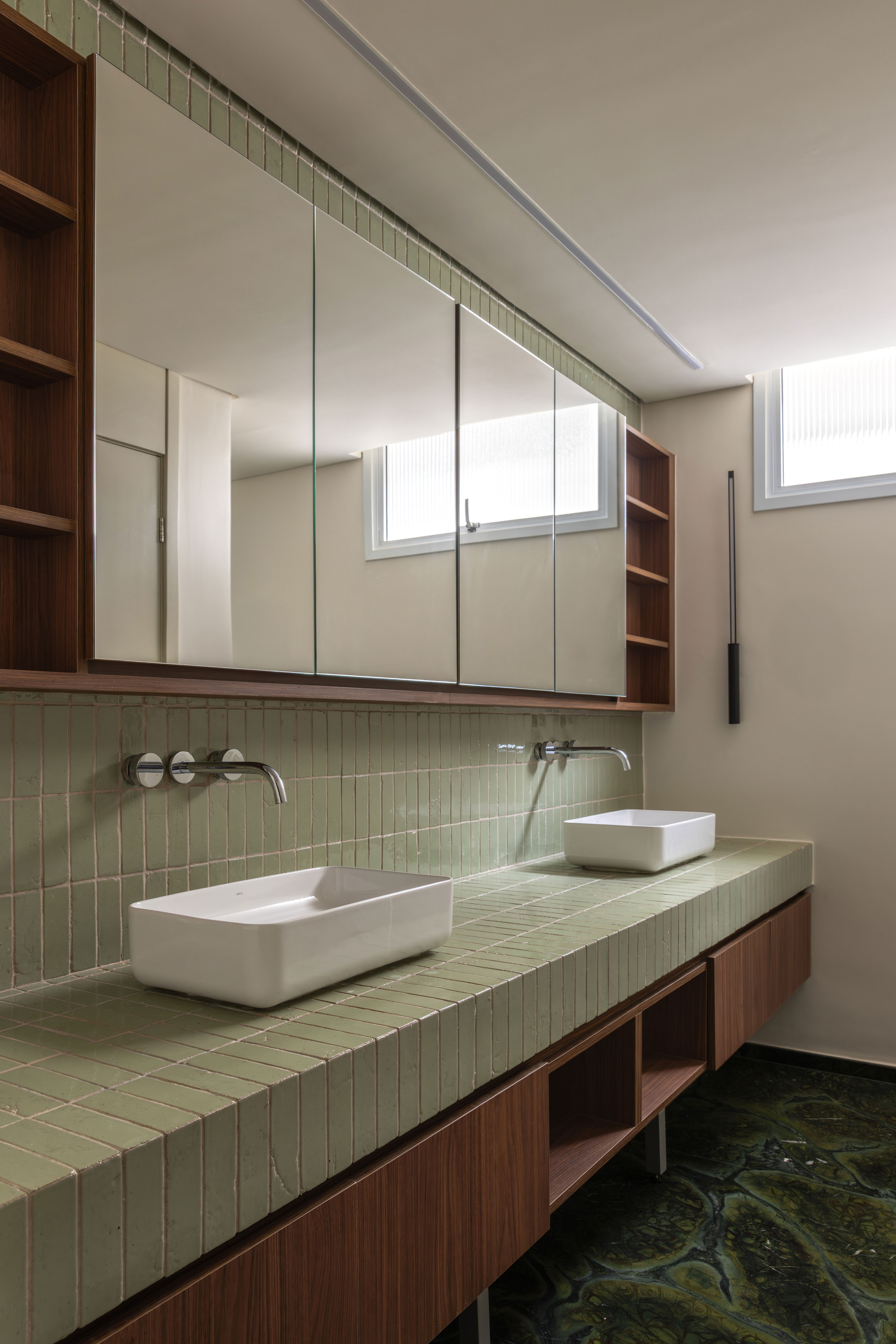 A suíte master, por sua vez, apresenta características de um hotel — outro pedido dos moradores —, incluindo carpete verde, luminária em papel dobrado e detalhes em madeira, em referência a uma viagem feita por eles ao Japão. A tonalidade verde se estende ao banheiro, com piso em mármore Avocado e na cerâmica que reveste a bancada.