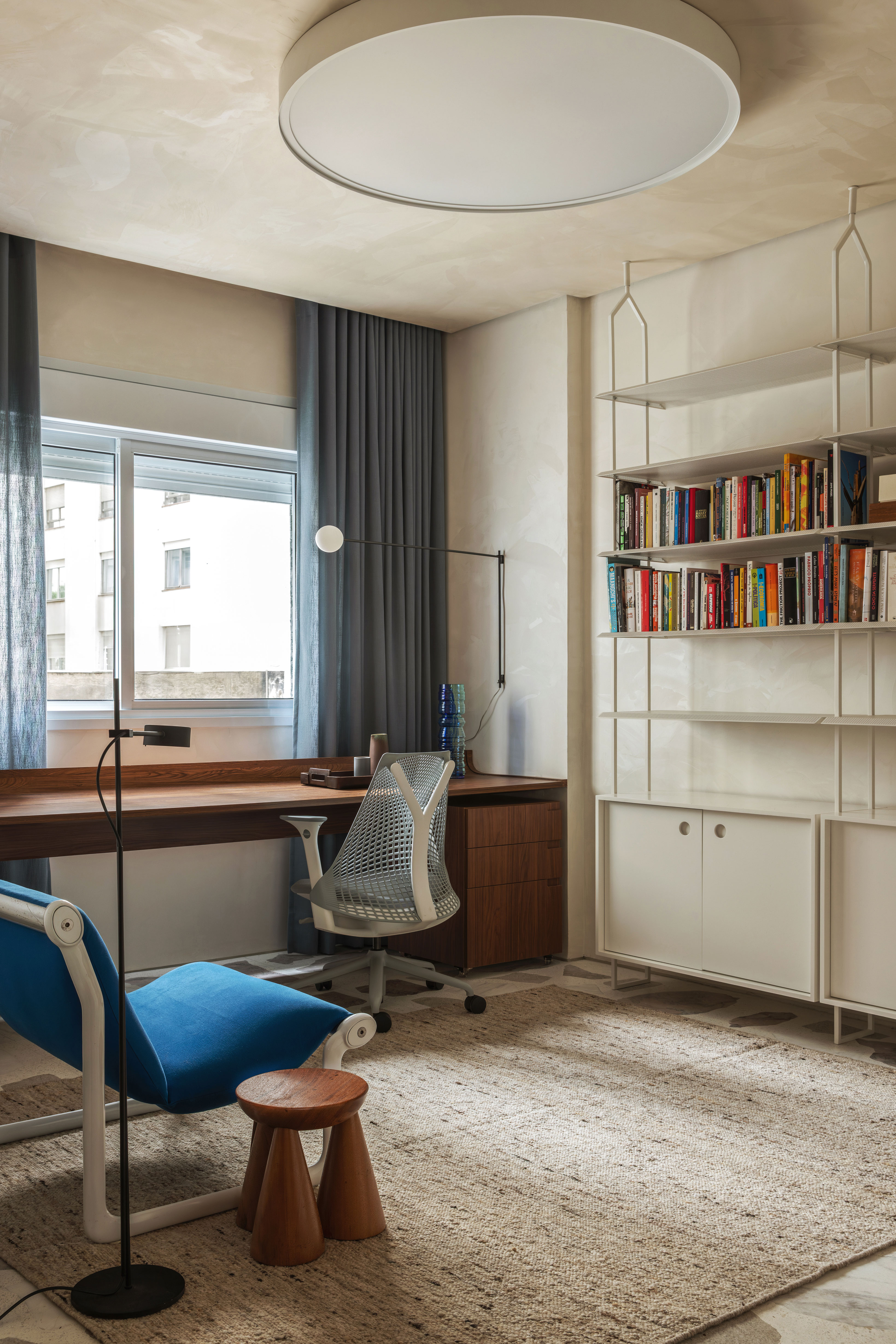 A identidade visual do lar foi fortemente influenciada pela preferência do casal por uma paleta vibrante e blocos de cor. A cozinha, integrada à sala de estar, foi executada em tons expressivos como o azul, que está presente no revestimento, marcenaria e pintura, criando unidade visual. A composição é complementada por acessórios de aço inoxidável, como bancadas e carrinhos, e por uma estante dedicada à exposição objetos pessoais adquiridos em viagens.