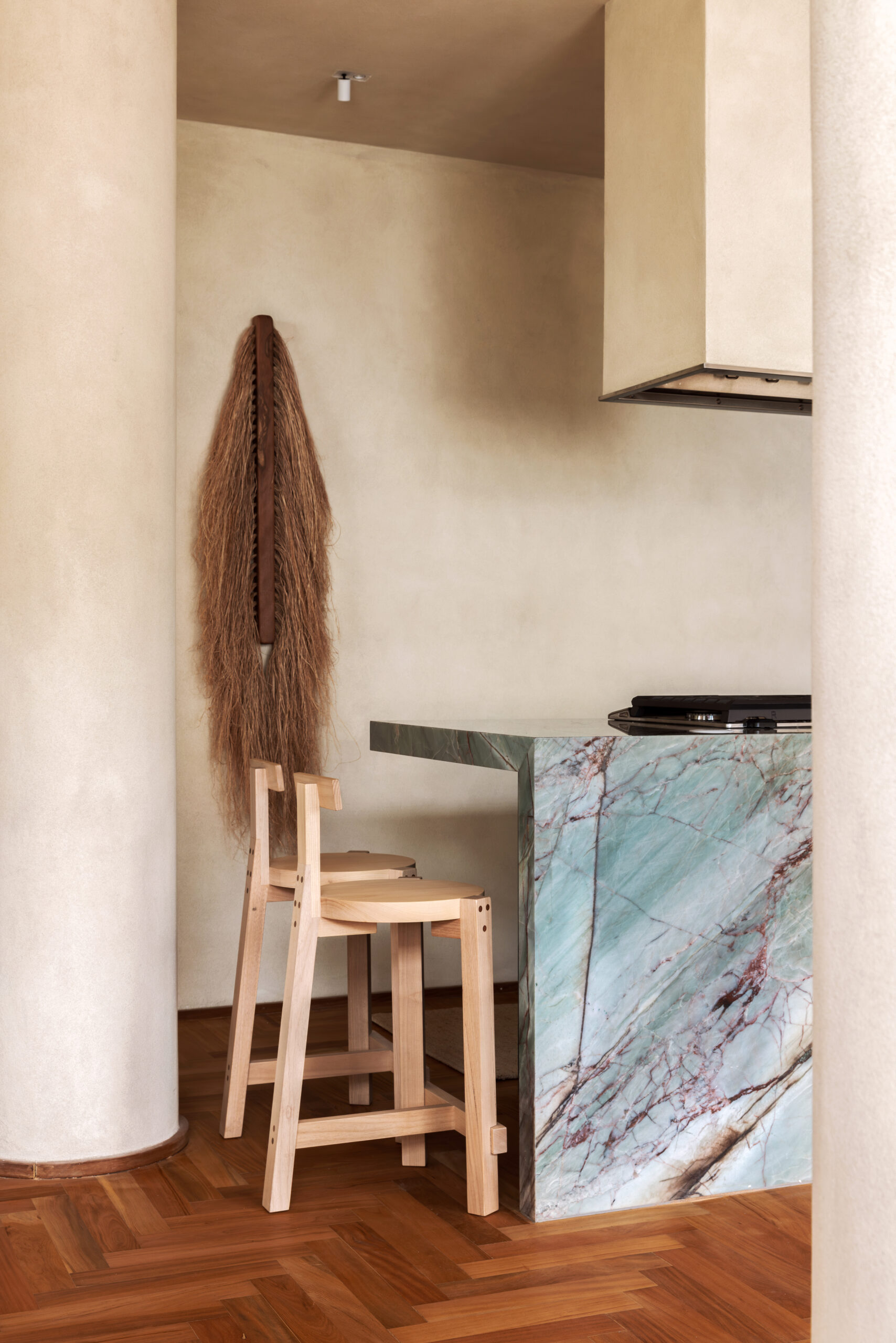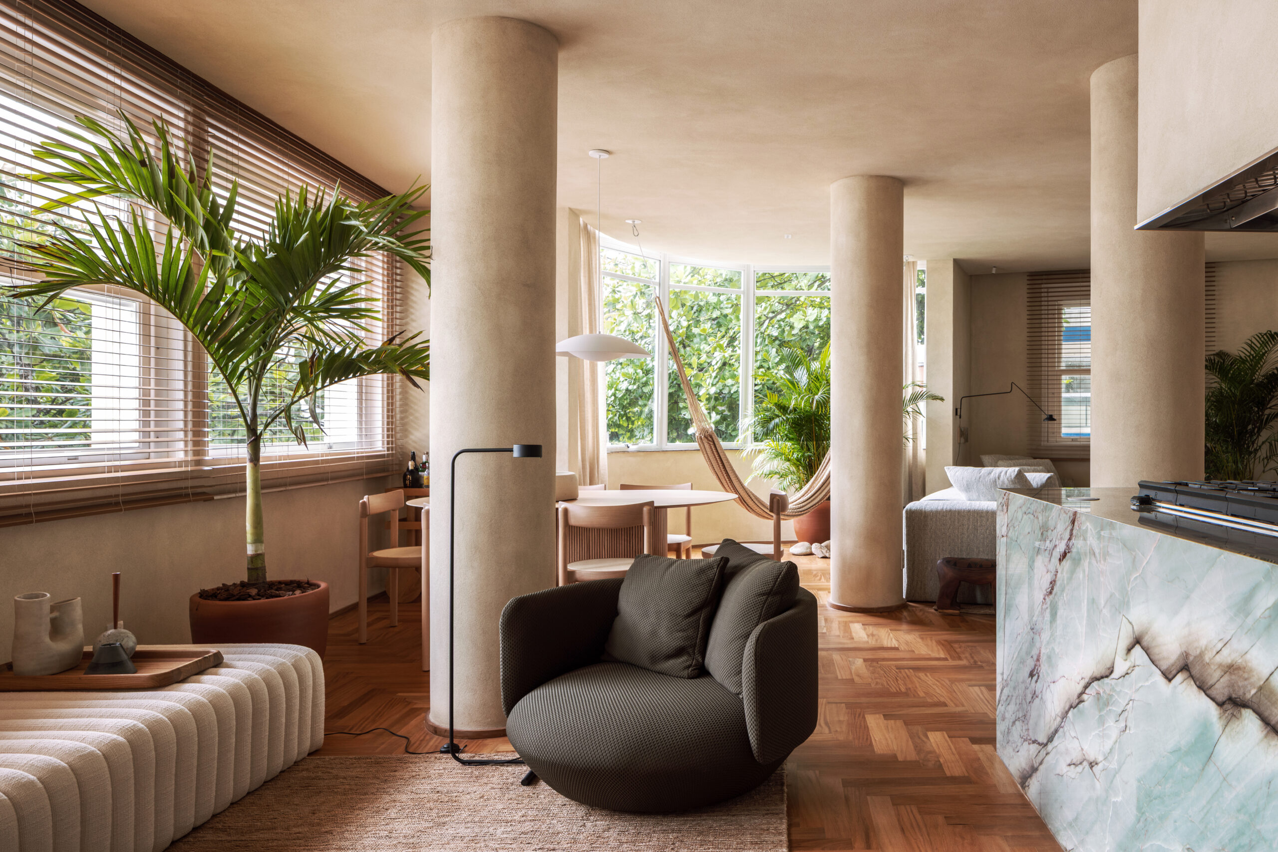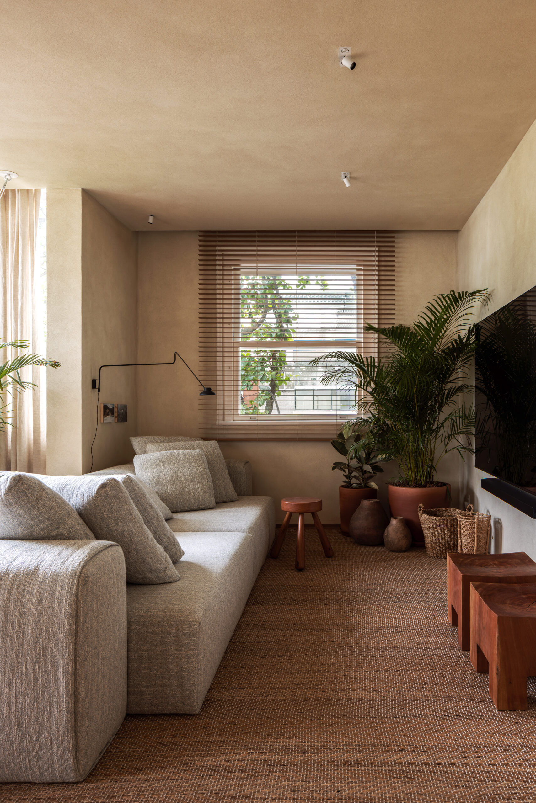 Todas as superfícies de alvenaria receberam a mesma textura de pigmentação natural em tom terroso, criando uma sensação contínua e sensorial. A referência para essa escolha vem da paisagem do Rio de Janeiro, evocando cores que remetem à areia da praia, ao verde azulado do mar e aos tons profundos da vegetação tropical.