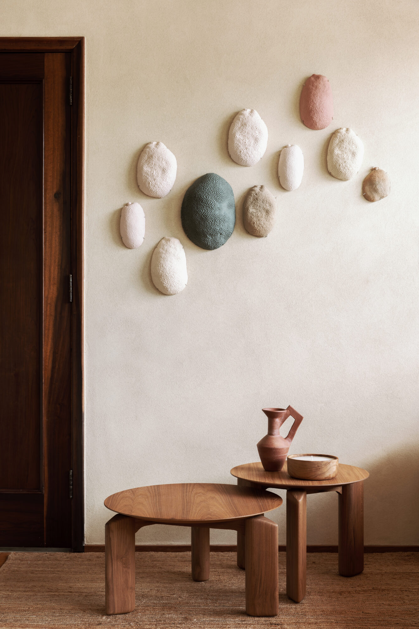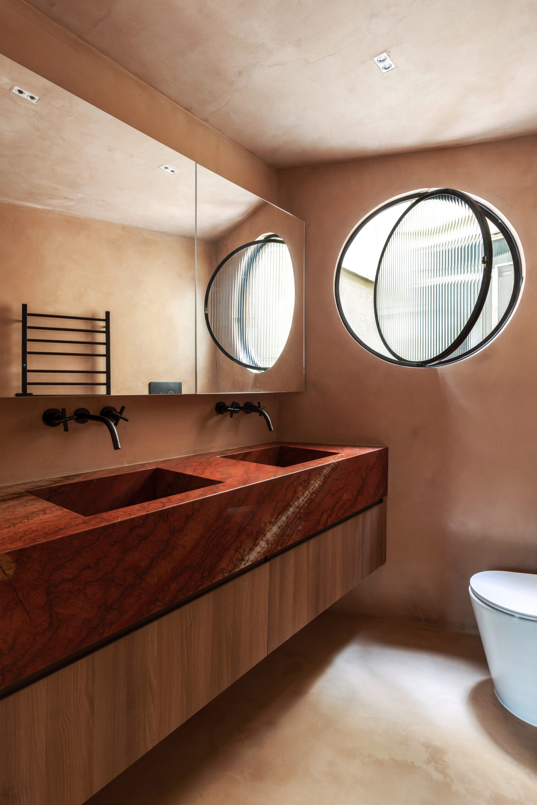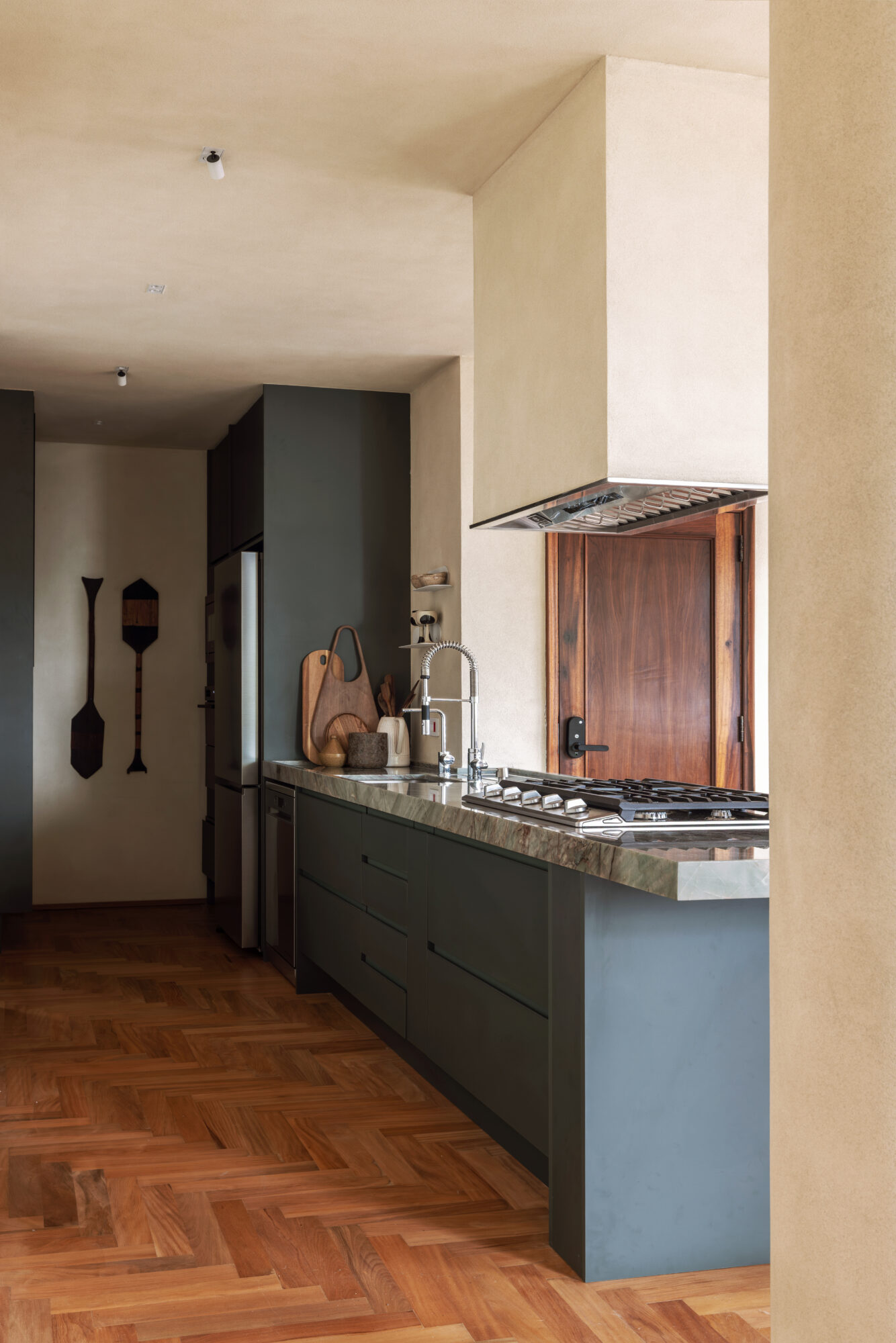 Todas as superfícies de alvenaria receberam a mesma textura de pigmentação natural em tom terroso, criando uma sensação contínua e sensorial. A referência para essa escolha vem da paisagem do Rio de Janeiro, evocando cores que remetem à areia da praia, ao verde azulado do mar e aos tons profundos da vegetação tropical.