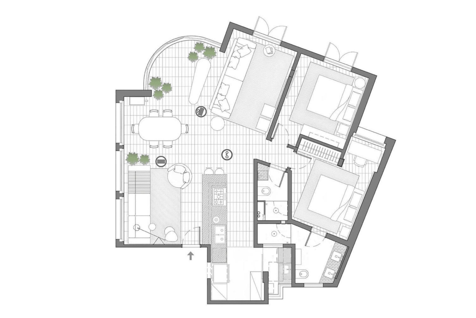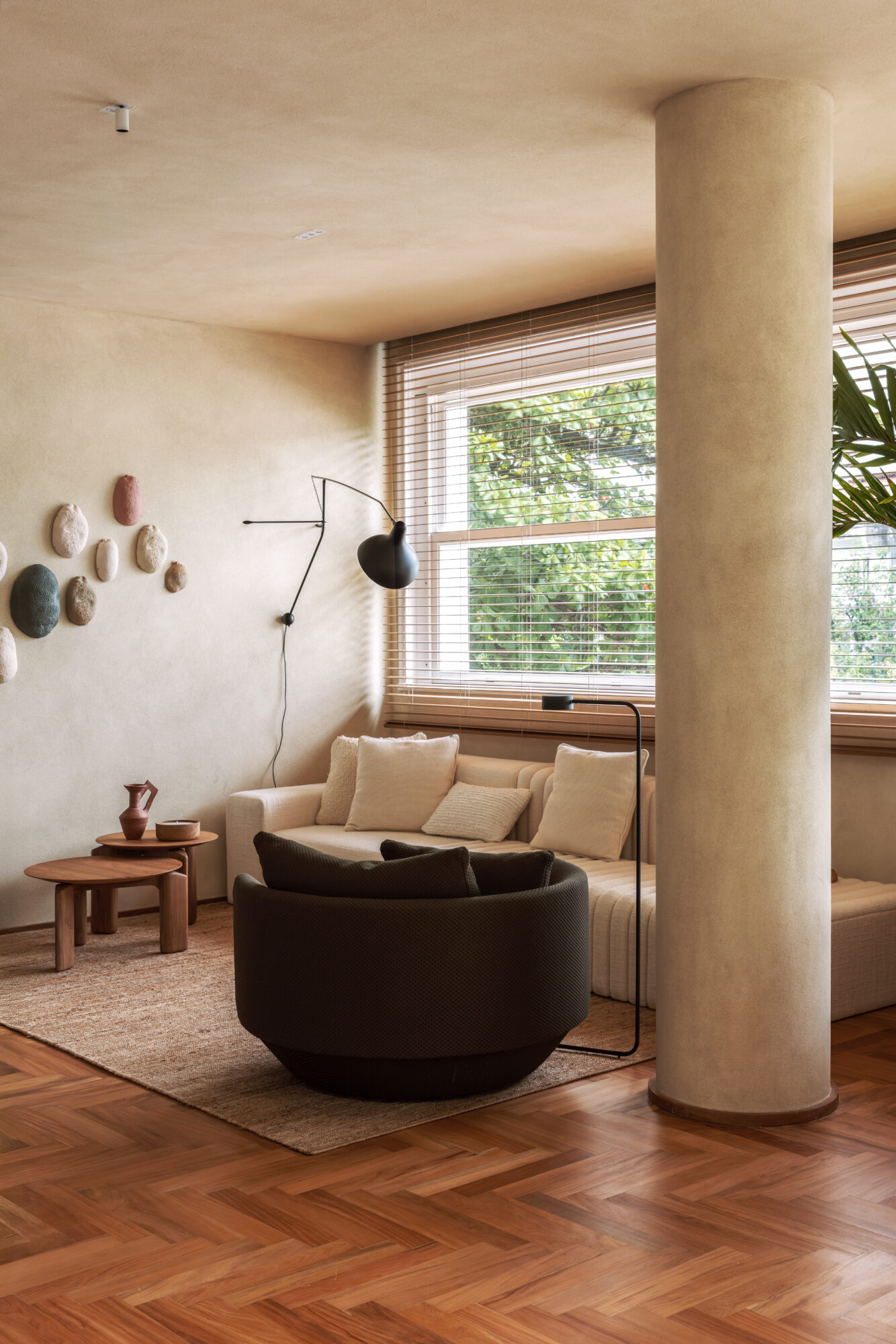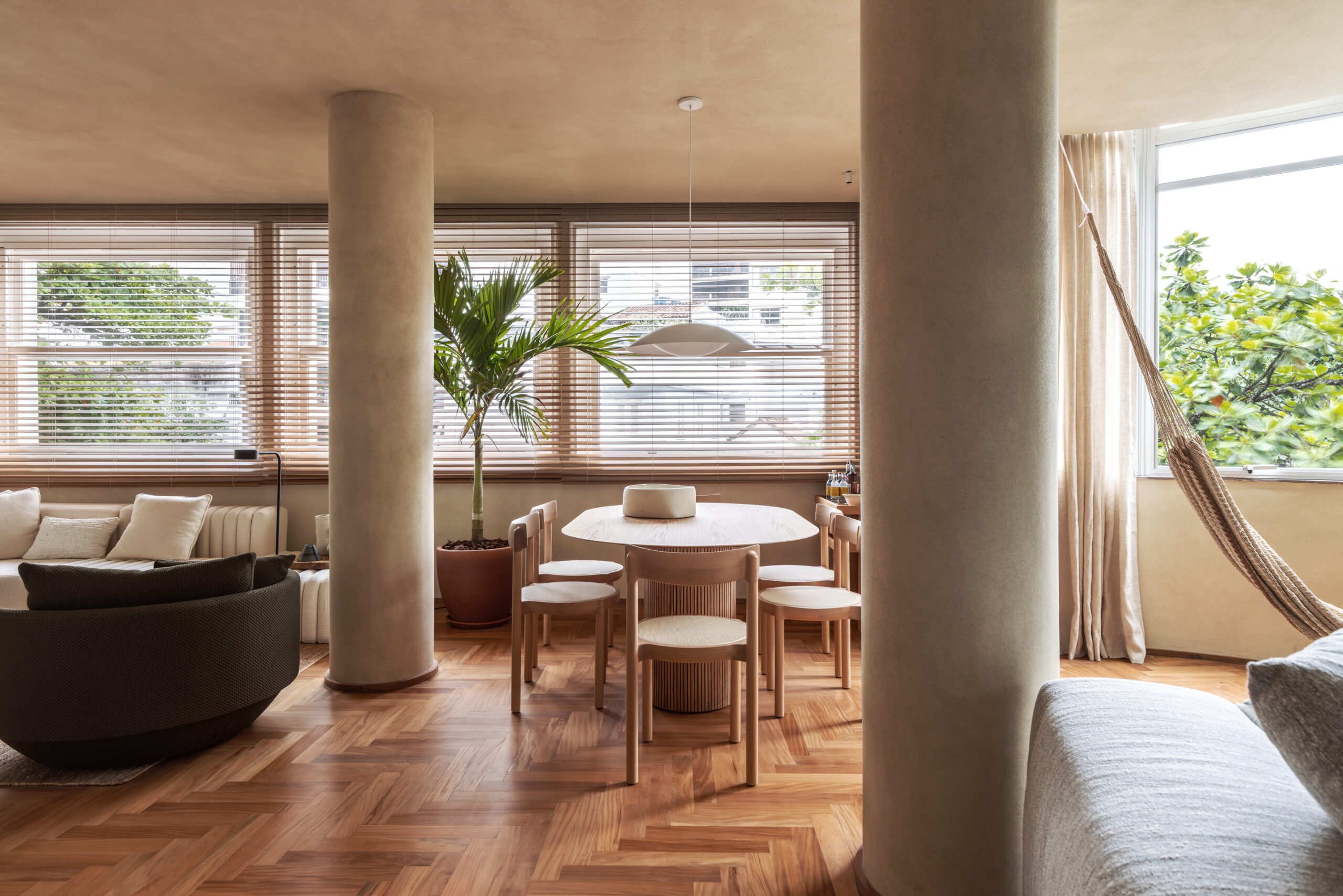 Durante a obra, colunas estruturais e prumadas hidráulicas com diferentes diâmetros foram reveladas no espaço social. Para organizar visualmente esses elementos e integrá-los à arquitetura, criamos pilares cilíndricos de gesso que conferem acabamento e unidade à composição.