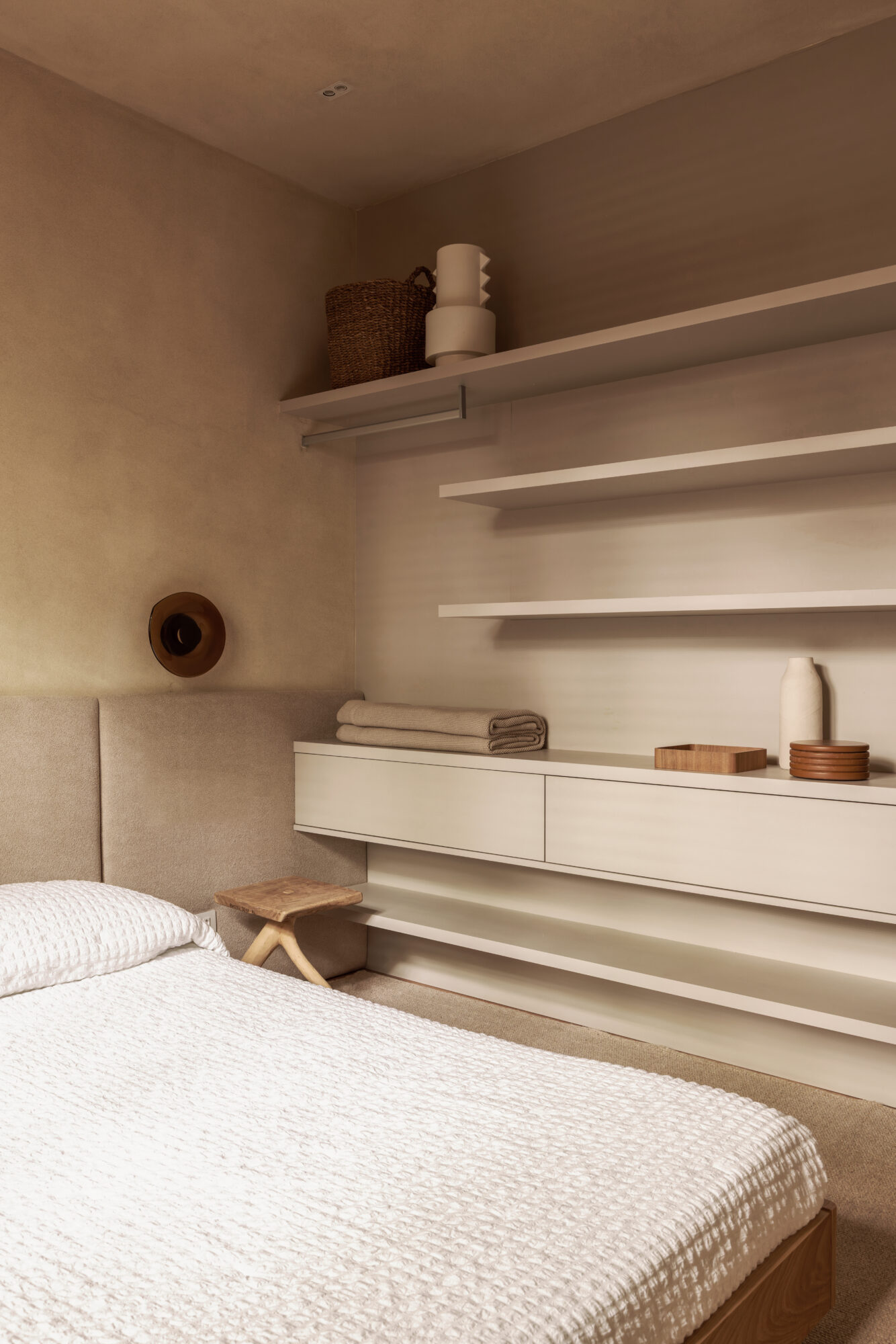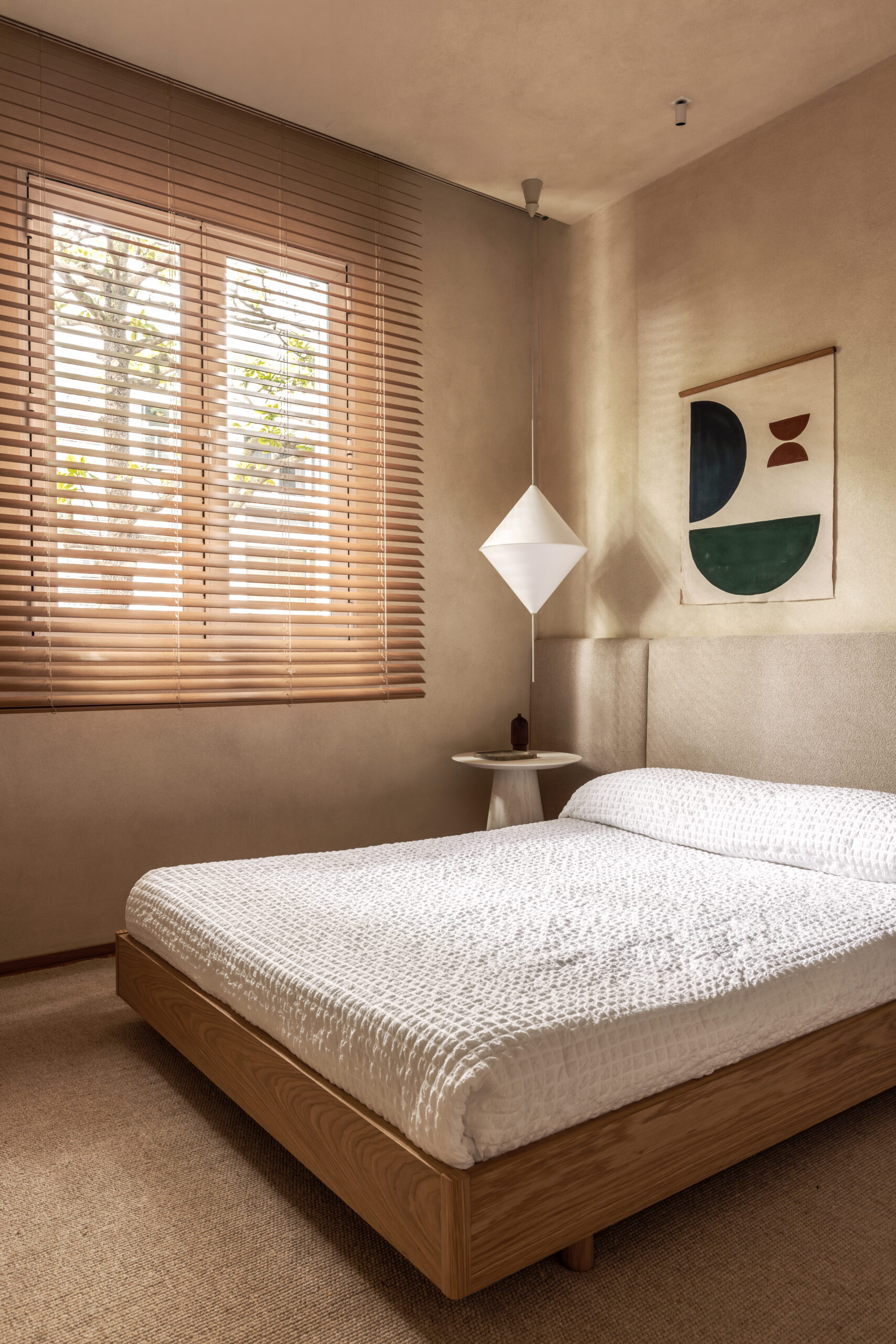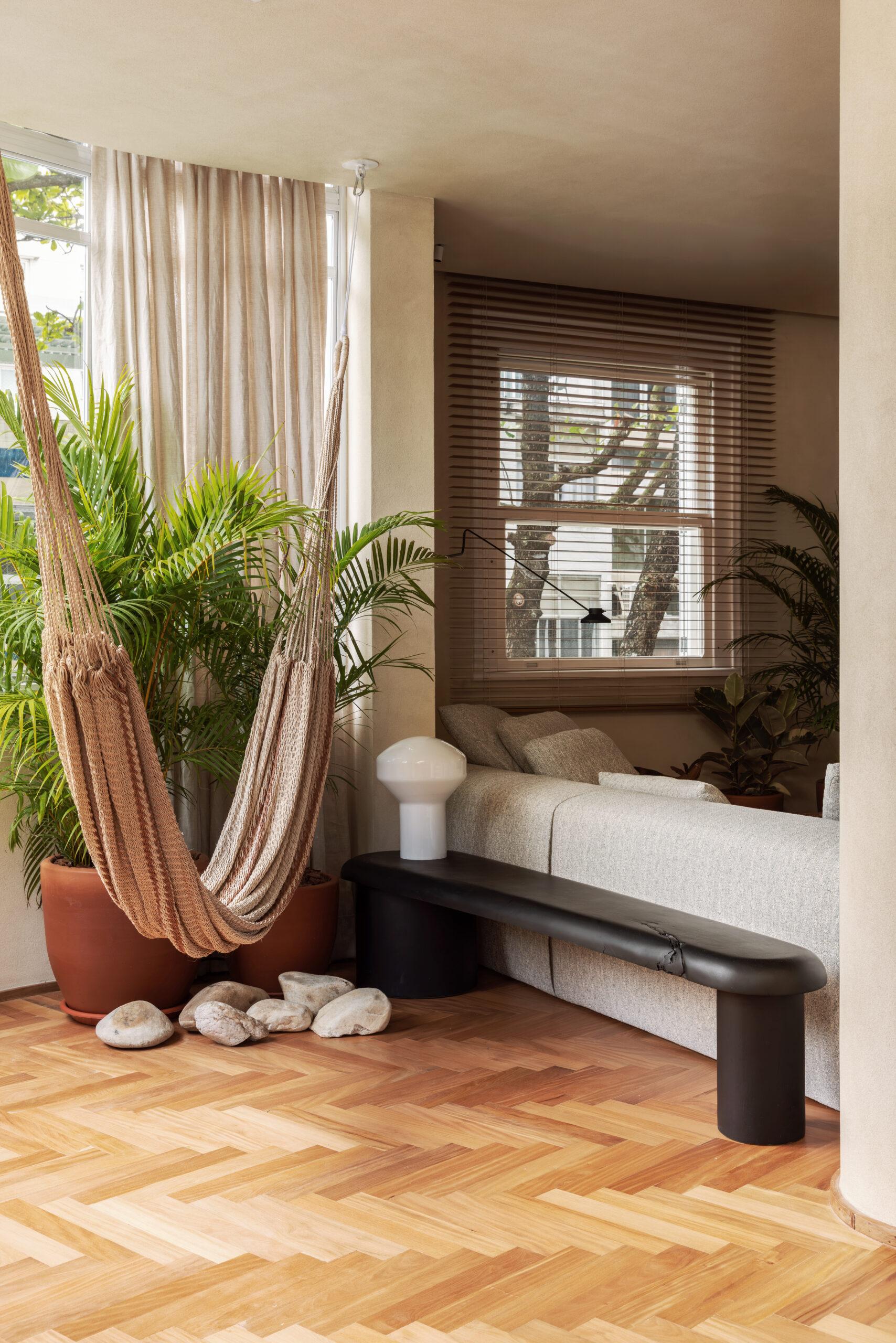 A paleta é reforçada na marcenaria, toda executada pela Madeirol. A combinação de madeira clara, materiais naturais e traços limpos aproxima o projeto da estética escandinava, enquanto elementos como camas baixas, luminárias em formato de globo e a valorização do essencial evocam referências do design oriental. O resultado é uma atmosfera híbrida que combina a sobriedade do estilo japandi com a leveza tropical do Rio de Janeiro.