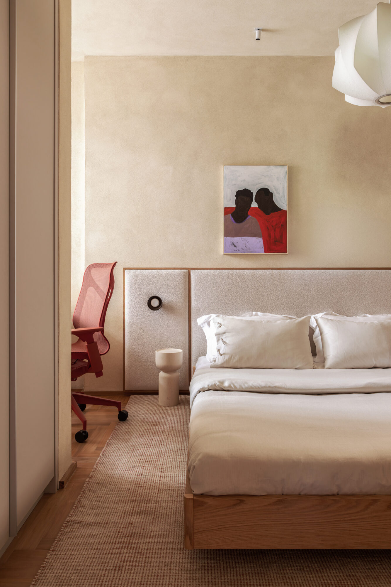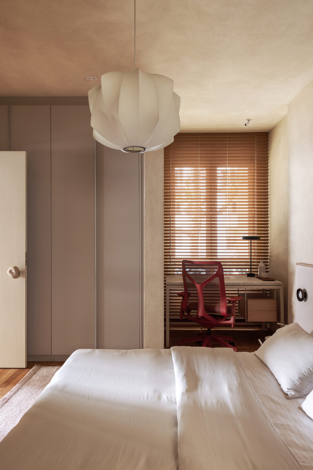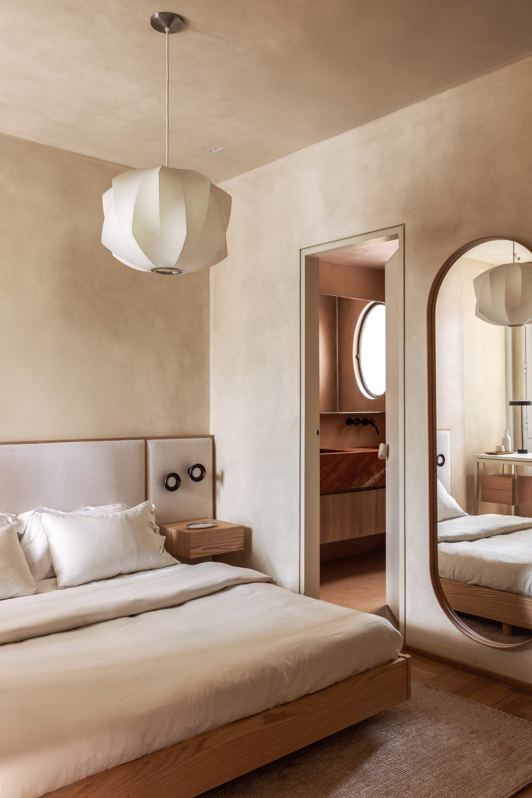 A paleta é reforçada na marcenaria, toda executada pela Madeirol. A combinação de madeira clara, materiais naturais e traços limpos aproxima o projeto da estética escandinava, enquanto elementos como camas baixas, luminárias em formato de globo e a valorização do essencial evocam referências do design oriental. O resultado é uma atmosfera híbrida que combina a sobriedade do estilo japandi com a leveza tropical do Rio de Janeiro.