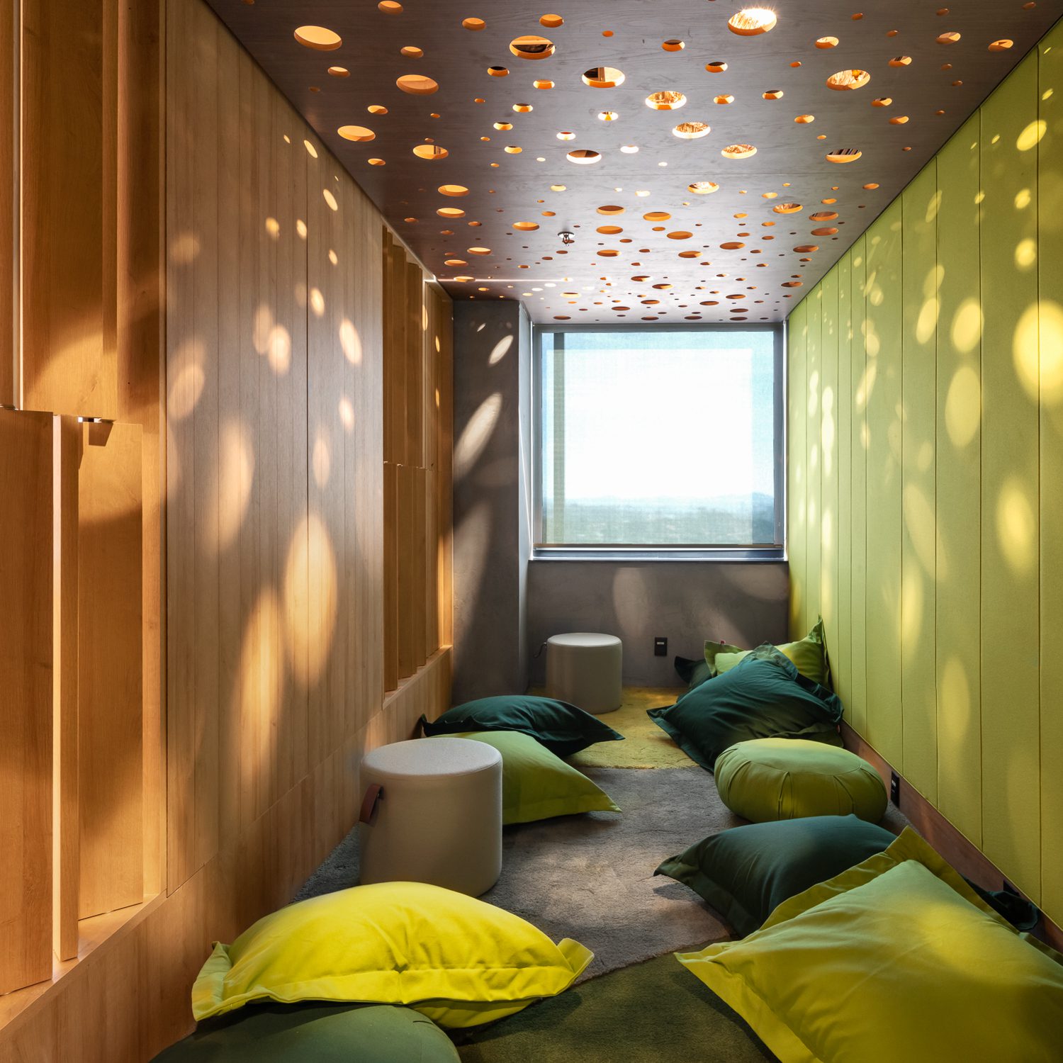 Já o último piso nos leva ao topo: à vista para o céu. Nele, o projeto de iluminação é protagonista, com suas curvas orgânicas que fazem referência ao movimento das nuvens. Os tons terrosos seguem presentes e os interiores exibem traços mais leves.
