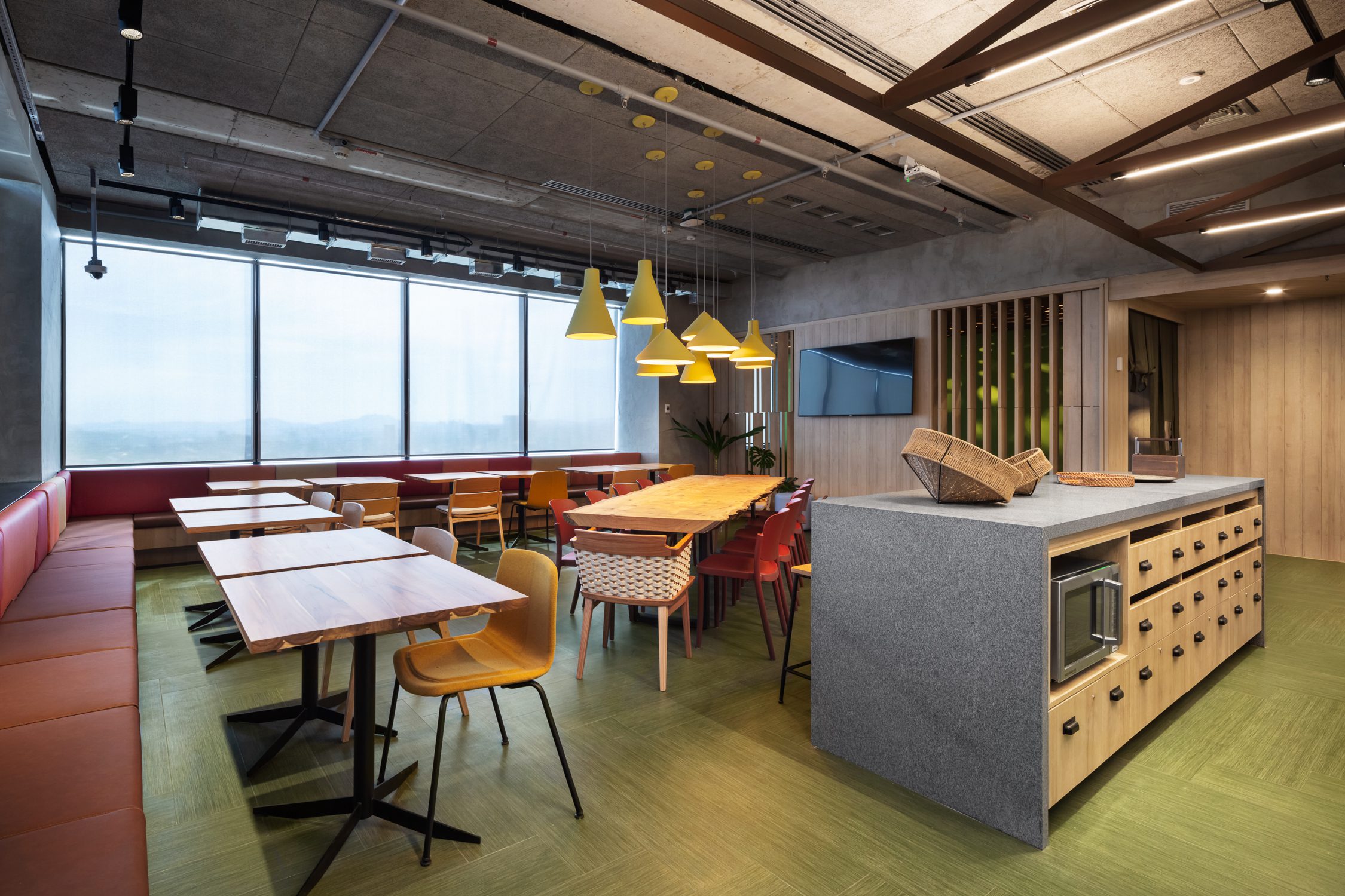 O segundo andar reflete o trajeto até o topo. Imaginamos esse percurso rodeado de natureza. Logo, a biofilia é a base das escolhas arquitetônicas e de interiores aqui. As áreas de refeição e descompressão, por exemplo, trazem a ideia de cabana. Materiais naturais e tons terrosos reforçam este storytelling.