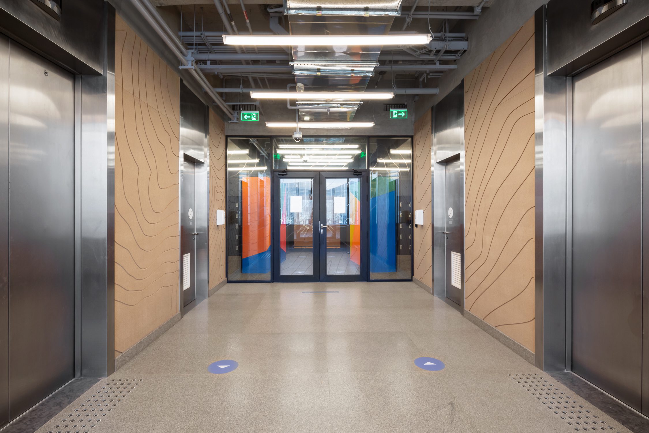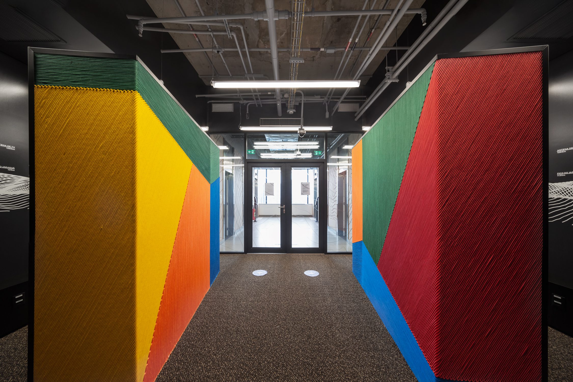 No primeiro piso, iniciamos os preparativos para a jornada. Nele, temos cores primárias que remetem aos materiais de segurança utilizados por escaladores. No hall de elevadores, os painéis com padrão de relevo fazem referência aos sopés. Em uma releitura, as cordas ganham um novo uso e revestem dois pilares que dão às boas-vindas a quem chega no Sky, escritório de um cliente confidencial no setor de tecnologia.